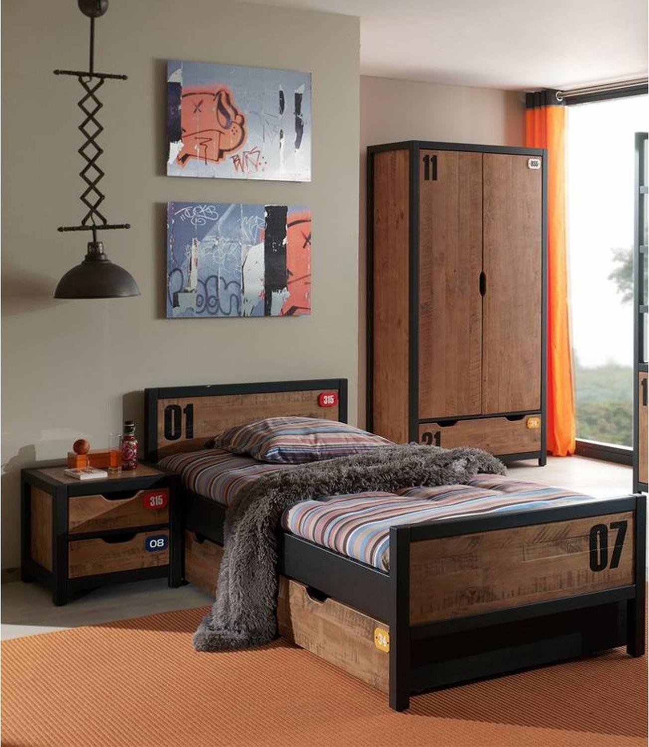 Artikelset Alex, best. aus: Nachtkonsole mit 2 geräumigen Schubladen, passend zum Programm Alex. Die Fronten und Seiten sind aus 18 mm starker massiver Kiefer. Die Rahmenkonstruktion ist aus hochwertigem MDF, 40 x 40 mm und schwarz beschichtet. Die Oberfläche ist gehobelt, gebürstet und cognacfarbig gebeizt. Da es sich um Massivholz handelt, kann die Oberfläche unterschiedliche Strukturen, farbliche Schattierungen und raue Stellen aufweisen. Das ist eine bewusst erzeugte "Industrial Style Optik", die eine Eigenschaft dieser Serie ist. Die Rückwand ist Dekor schwarz beschichtet. Abgesetzt sind die Fronten mit netten Applikationen und Zahlen. Durch die ausgeschnittene Grifföffnung lassen sich die Schubladen leicht bedienen. Die Schubaden (Innenmaß ca. B: 37 x H: 15 x T: 30 cm) haben einen Metallauszug. Die Beschläge sind aus Metall. Der Artikel ist zerlegt, mit Aufbauanleitung zur einfachen Selbstmontage: Stellfläche ca.: B: 50 H: 45 T: 40 cm. Schickes Einzelbett mit 90x200 cm Liegefläche, zum Programm Alex. Die Rahmenkonstruktion ist aus hochwertigem MDF, 40 x 40 mm und schwarz beschichtet. Die Füllungen von Kopf- und Fußteil sind aus 18 mm starker massiver Kiefer. Die Oberfläche ist gehobelt, gebürstet und cognacfarbig gebeizt. Da es sich um Massivholz handelt, kann die Oberfläche unterschiedliche Strukturen aufweisen. Abgesetzt sind die Fronten mit netten Applikationen und Zahlen. Ein Lattenrost, sowie eine Matratze ist nicht im Lieferumfang enthalten. Die Einlegetiefe für den Lattenrost und die Matratze beträgt ca. 7 cm. Durch die Metall Eckverstrebungen ist das Bett nur für einen festen Lattenrostrahmen geeignet, nicht für einen Rolllattenrost. Das Bett ist unten offen. Die Beschläge sind aus Metall. Die Ware ist zerlegt, mit Montageanleitung zur einfachen Selbstmontage. Stellfläche ca.: B: 97 x H: 75 x T: 209 cm. Passend zum Einzelbett Alex, eine Bettschublade mit Innenmaß ca. B:195 x H: 15 x T: 90 cm. Die Front ist aus 18 mm starker massiver Kiefer. Die Oberfläche ist gehobelt, gebürstet und cognacfarbig gebeizt. Da es sich um Massivholz handelt, kann die Oberfläche unterschiedliche Strukturen aufweisen. Die Seiten und Bodenplatten sind Dekor schwarz beschichtet. Durch die ausgeschnittene Grifföffnung lässt sich die Schublade leicht bedienen. Mit dem Rollenauszug lässt sich die Schublade einfach hinaus ziehen und herein schieben. Die durchgehende Bodenplatte ermöglicht, die Schublade als zusätzlichen Stauraum zu nutzen. Die Beschläge sind aus Metall. Der Artikel ist zerlegt, mit Aufbauanleitung zur einfachen Selbstmontage. Geräumiger Kleiderschrank in Kiefer teilmassiv, mit 2 Türen und einer Schublade, passend zum Programm Jugendzimmer Alex. Die Rahmenkonstruktion ist aus hochwertigem MDF, 40 x 40 mm und schwarz beschichtet. Die Fronten und Seiten sind aus 18 mm starker massiver Kiefer. Die Oberfläche ist gehobelt, gebürstet und cognacfarbig gebeizt. Da es sich um Massivholz handelt, kann die Oberfläche unterschiedliche Strukturen aufweisen. Die Rückwand ist Dekor schwarz beschichtet. Abgesetzt sind die Fronten mit netten Applikationen und Zahlen. Durch die ausgeschnittene Grifföffnung lassen sich die Türen und die Schublade (Innenmaß ca.: B:90xH:24xT:40 cm) leicht bedienen. Innen hat der Kleiderschrank oben einen Boden, darunter eine Kleiderstange. Unten befindet sich noch mal ein Ablageboden. Somit bietet er viel Stauraum. Die Beschläge sind aus Metall und der Artikel hat an den Schrankfüßen eine Höhenverstellung. Die Ware ist zerlegt, mit Aufbauanleitung zur einfachen Selbstmontage. Benötigte Stellfläche ca.: B: 100 H: 200 T: 55 cm.
