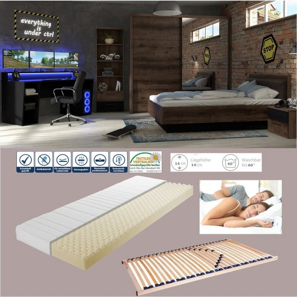 Jugendzimmer 111050 =================== Jugendzimmer Gamingzimmer Tezaur "Jacky" 7 teilig in Schlammeiche mit Schwarzeiche mit Matratze und Lattenrost im Lieferumfang enthalten: **Allgemeines:** mit großem Gaming Schreibtisch inklusive RGB LED Wechselbeleuchtung/USB ABS-Kanten Computer Tower rechts oder links installierbar mit platzsparendem Schwebetürenschrank, Bett und Standregal Spanplatten der Güteklasse E1 mit Deckorfolie beschichtet Kleiderstangen und Scharniere aus Metall Pflegeleichte und strapazierfähige Oberflächen zerlegte Ware, einfacher Aufbau anhand sehr gut verständlicher Anleitung inklusive Lattenrost und Deluxe 7- Zonen Kaltschaummatratze **Gamingtisch:** Maße ca. 160 x 91,1 x 72 cm (BxHxT) Abstellfläche für Monitore 160x17 cm (B/T), für bis zu drei Monitore, belastbar bis max. 10 kg aufgrund der großen Tischplatte auch als normaler Schreibtisch gut nutzbar Schreibtischplatte mit Kabeleinlass, dadurch Möglichkeit zur verdeckten Kabelführung, belastbar bis max. 20 kg Computer Tower rechts oder links installierbar inklusive RGB LED Wechselbeleuchtung/USB **Schwebetürenschrank:** Maße ca. 170,3 x 210,5 x 62,5 cm (BxHxT) mit zwei Schwebtüren innen durch eine Mittelseite zweigeteilt hinter jeder Tür ein Boden und eine Kleiderstange Böden je belastbar bis max. 10 kg Kleiderstangen je belastbar bis max. 15 kg **Passepartout:** **Bett:** Liegefläche 140x200 cm (BxL) Aufstellmaße ca. 146,2 x 87,7 x 209,6 cm (BxHxT) mit gepolstertem Kopfteil in Lederoptik Braun **Standregal:** Maße ca. 60,2 x 189,1 x 34,8 cm (BxHxT) unten zwei Schubkästen, belastbar bis 3 kg oben drei Böden, belastbar bis 5 kg **Lattenrost:** Lattenrost 140x200 cm 28 mehrfach verleimte Federholzleisten Außenholme und Leisten aus naturbelassenem Schichtholz Querholme aus massiver Buche Lagerung der Leisten elastisch und geräuschlos in Duokappen Individuelle Härteverstellung im Mittelzonenbereich durch Doppelleistentechnik Für alle Matratzentypen geeignet Empfohlenes max. Nutzergewicht 90 kg Lieferung der Einzelteile im Karton zur Selbstmontage **Deluxe 7- Zonen Kaltschaummatratze:** Maße 140x200 cm (BxH) Matratzenhöhe ca. 18 cm Luxus Matratze Kaltschaummatratze geeignet universell bis 100kg fester Liegekomfort softig- flexibel und formstabil 7 Zonen für eine gute Wirbelsäulenanpassung Atmungsaktiv und punktelastisch elastischer und atmungsaktiver Doppeltuchbezug mit wellenförmiger Steppung für den optimalen Klimaausgleich Hautfreundlicher Bezugsstoff (100 % Polyester) Bezug doppelseitig abnehmbar und waschbar bis 60 Grad Celsius umlaufender Reißverschluss eingenähte Schlaufen an den schmalen Seiten erleichtern die Handhabung mit ergonomisch fein abgestimmten Matratzenkern Schadstoff geprüft und gesundheitlich sicher alle Schichten entsprechen dem ÖKO- TEX ® Standart 100, Klasse 1 schadstoffgeprüft antibakteriell Allergikergeeignet wird gerollt und vakuumverpackt geliefert **Farbe:** Korpus und Fronten: Schlammeiche kombiniert mit Schwarzeiche und einzelnen Schriftzügen Gamingtisch in Schwarz mit RGB LED Wechselbeleuchtung **Dekoration und Nachttisch nicht enthalten, kann aber auf Wunsch seperat bestellt werden. Bitte kontaktieren Sie uns!**