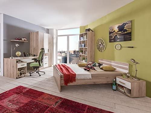 **Kleiderschrank:** Maße ca. 135 x 199 x 58 cm (BxHxT) dreitüriger Kleiderschrank hinter der linken und rechten Tür je ein Einlegeboden und eine Kleiderstange hinter der mittleren Tür zwei Einlegeböden unter der mittleren Tür drei Schubkästen **Jugendbett:** Liegefläche 90x200 cm (BxT) Stellmaße ca. 96 x 87 x 205 cm (BxHxT) ohne Lattenrost und Matratze **Nachtschrank:** Maße ca. 46 x 38 x 40 cm (BxHxT) mit einem Schubkasten und einem Freifach **Schreibtisch:** Maße ca. 140 x 72 x 70 cm (BxHxT) **Rollcontainer:** Maße ca. 46 x 59 x 45 cm (BxHxT) mit einem Schubfach und einem großen Freifach **Standregal:** Maße ca. 90 x 198 x 38 cm (BxHxT) mit vier Einlegeböden jedes Freifach nochmals in zwei oder drei Fächer senkrecht unterteilt **Wandregal:** Maße ca. 78 x 3 x 25 cm (BxHxT) **Farbe:** Korpus und Front: Eiche San Remo Nachbildung Absetzung: Weiß