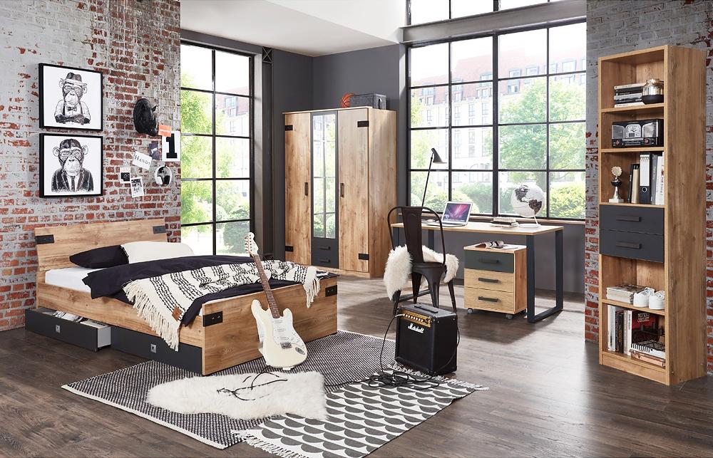 **Materialdaten | Oberflächen:** - Korpus / Front: Qualitätsspanplatte E1 mit Melaminharzbeschichtung - Dekor / Farbe: Plankeneiche Nb. mit Absetzungen in Graphit - Plankeneiche Nb. mit strukturierter Oberfläche - Beschläge und Scharniere: Metall **Lieferumfang | Produktinformationen | Maßangaben:** - Jugendzimmer Set bestehend aus: - 1x Jugendbett, Liegefläche: 120x200 cm, Betthöhe: 43,5cm, (ohne Matratze und Lattenrost), BxHxT ca. 126 x 85 x 210 cm - Bettschubkästen-Set, 2x Schubkasten je BxHxT ca. 100 x 16 x 60 cm - 1x Schreibtisch, 1 Schubkasten, BxHxT ca. 140 x 75 x 70 cm - 1x Rollcontainer , 3 Schubkästen, BxHxT ca. 46 x 58 x 40 cm - 1x Kleiderschrank, 3 Türen, davon 1 Spiegeltür, 4 Einlegeböden, 5 Fächer, 2 Schubkästen, Kleiderstange, BxHxT ca. 135 x 198 x 58 cm - 1x Regal mit Schubkästen, 4 Fächer, 3 Fachböden, 2 Schubkästen mit Vollauszug, B/H/T: ca. 47 x 198 x 38 cm **allgemeine Qualitätsmerkmale:** - Qualitäts-Dekor-Spanplatte - hochwertige Melaminharzbeschichtung - Metallscharniere und -beschläge - strapazierfähige und unempfindliche Oberflächen - hohe Kratz- und Stoßfestigkeit - Made in Germany **Montage | Lieferung:** - Lieferung erfolgt zerlegt zur Selbstmontage - einfache bebilderte Montageanleitung - schneller Aufbau durch intelligente Konstruktion - Lieferung erfolgt per Spedition