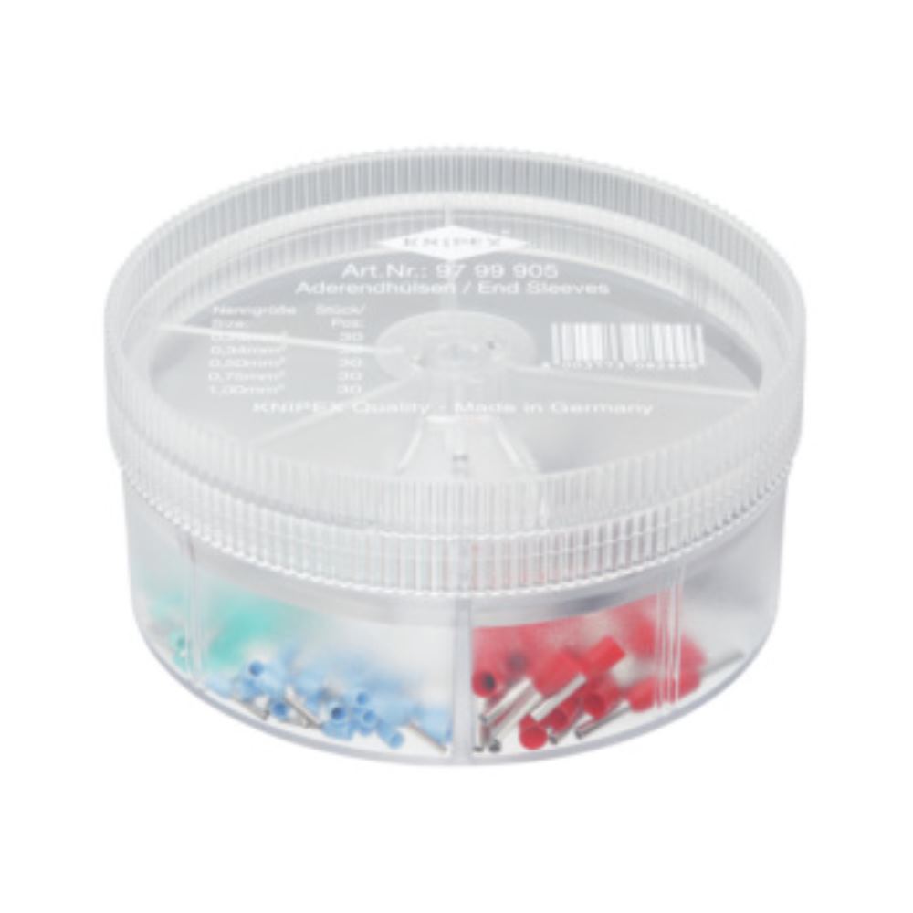 - Das KNIPEX 97 99 910 Aderendhülsen-Sortiment bietet eine breite Auswahl von 1.900 Aderendhülsen in fünf verschiedenen Größen von 0,50 mm² bis 2,50 mm².