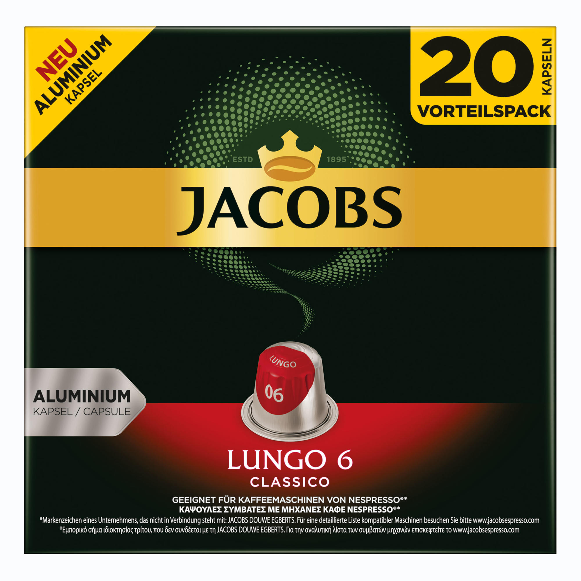 - Jacobs Lungo 6 Classico Kaffeekapseln sind Nespresso-kompatibel und bieten eine bequeme Lieferung als Großpackung mit 200 Kapseln.