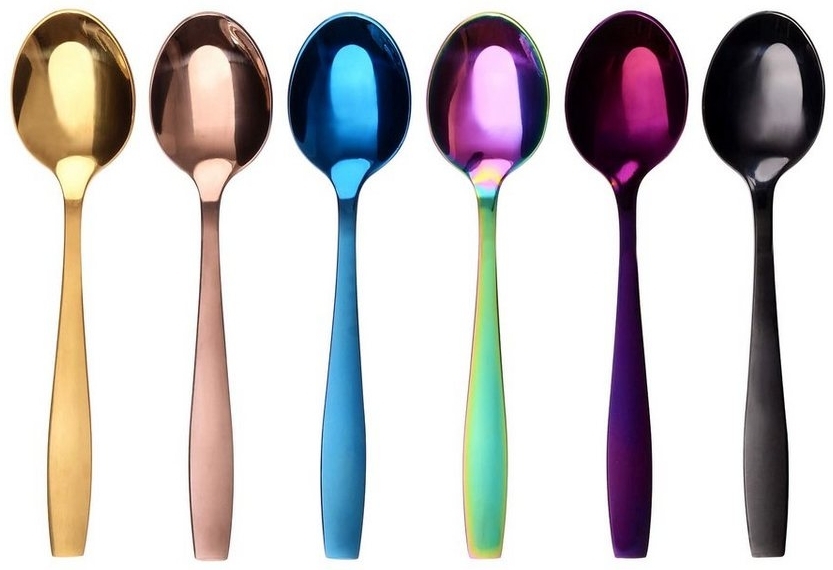 das Set zu einem perfekten Begleiter für Ihren Kaffee. **Highlights** - Set bestehend aus 6 Kaffeelöffeln in lebendigen Farben - Hergestellt aus hochwertigem Edelstahl 18/0 Chromstahl - Schlichtes und einfaches Design passt zu jedem Tisch- und Kaffeeservice - Polierte Ausführung verleiht den Löffeln einen edlen Glanz - Spülmaschinengeeignet für eine einfache Reinigung **Produkteigenschaften** - Material: Edelstahl 18/0 Chromstahl - Farben: Gold, Rotgold, Schwarz, Regenbogen, Blau, Lila - Länge: ca. 13,4 cm - Laffe: ca. 4 x 3 cm - Griffstärke: ca. 2 mm - Gewicht pro Löffel: ca. 20 g - Gesamtgewicht des Sets: ca. 122 g **Lieferumfang** - 6 Kaffeelöffel, Edelstahl Farbenmix, Serie Königstein