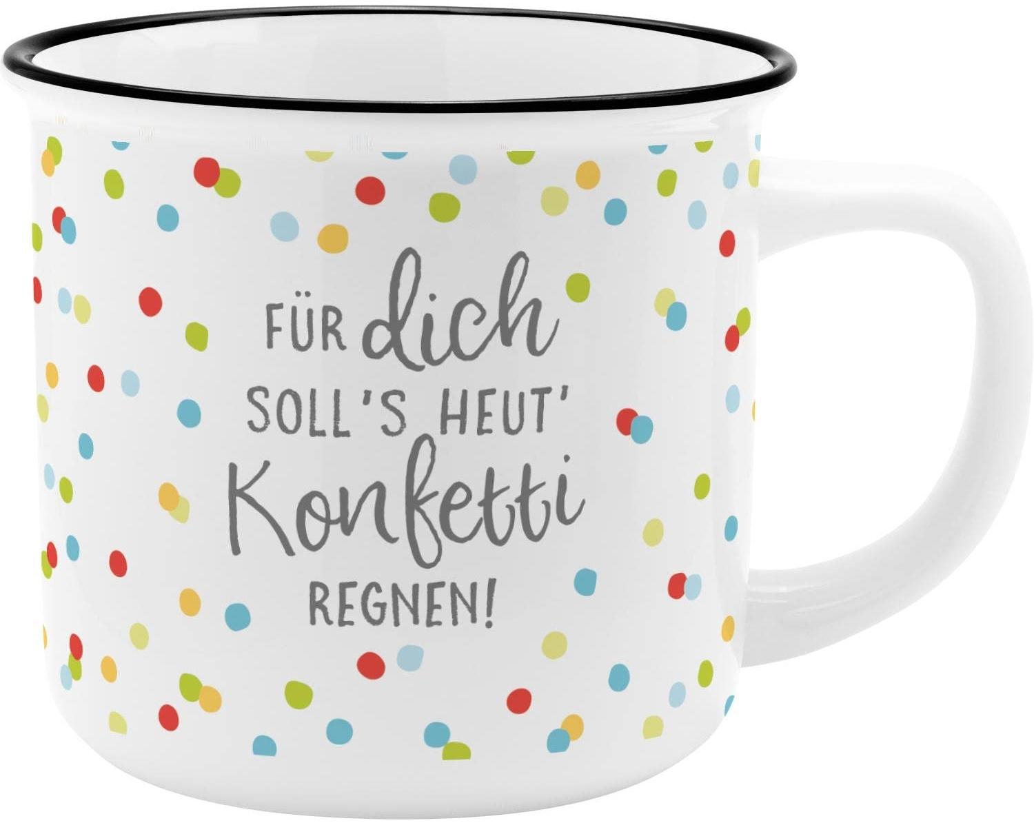 Der Becher "Konfetti" von GRUSS & CO ist ein nostalgischer Kaffeebecher im angesagten Retro-Design. Hergestellt aus hochwertigem New Bone China Porzellan, bietet er ein Volumen von 35 cl. Mit seinem liebevollen Motivdruck und der Emaille-Optik bringt er Farbe und frischen Wind in jede Kaffeerunde oder ins Büro. Ideal als Geschenk verpackt in einer ansprechenden Geschenk-Banderole. **Highlights** - Nostalgischer Vintage-Look in Emaille-Optik - Becher mit farbigem Motivdruck und Spruch "Konfetti" - Material: New Bone China Porzellan - Volumen: 35 cl - Verpackt in passend gestalteter Geschenk-Banderole **Produkteigenschaften** - Material: New Bone China Porzellan - Volumen: 35 cl - Nostalgisches Retro-Design in Emaille-Optik - Farbiges Motivdruck mit Spruch "Konfetti" - Ideal als Geschenk für Familie, Freunde, Kollegen **Lieferumfang** - 1x Becher "Konfetti"