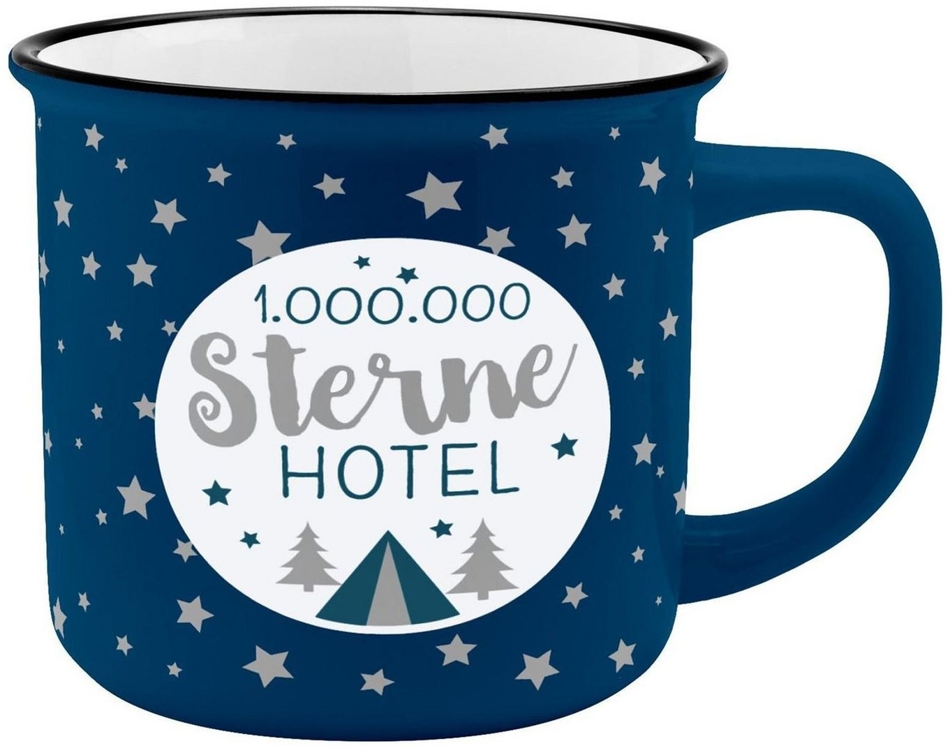 Der Becher 1.000.000 Sterne Hotel ist aus hochwertigem New Bone China Porzellan gefertigt und verleiht mit seinem nostalgischen Emaille-Look eine besondere Optik. Mit dem passenden Text ist er ein ideales kleines Geschenk. Der Becher wird in einer Geschenkbox aus Pappe geliefert. Maße: 84 x 110 x 90 mm. **Highlights** - Hochwertiges New Bone China Porzellan - Nostalgischer Emaille-Look - Dekorative Geschenkbanderole aus Pappe - Fassungsvermögen ca. 35 cl - Pflegeleicht und robust **Produkteigenschaften** - Material: New Bone China Porzellan - Farbe: Mehrfarbig - Maße: 84 x 110 x 90 mm - Fassungsvermögen: ca. 35 cl **Lieferumfang** - 1 Tasse in Geschenkbox