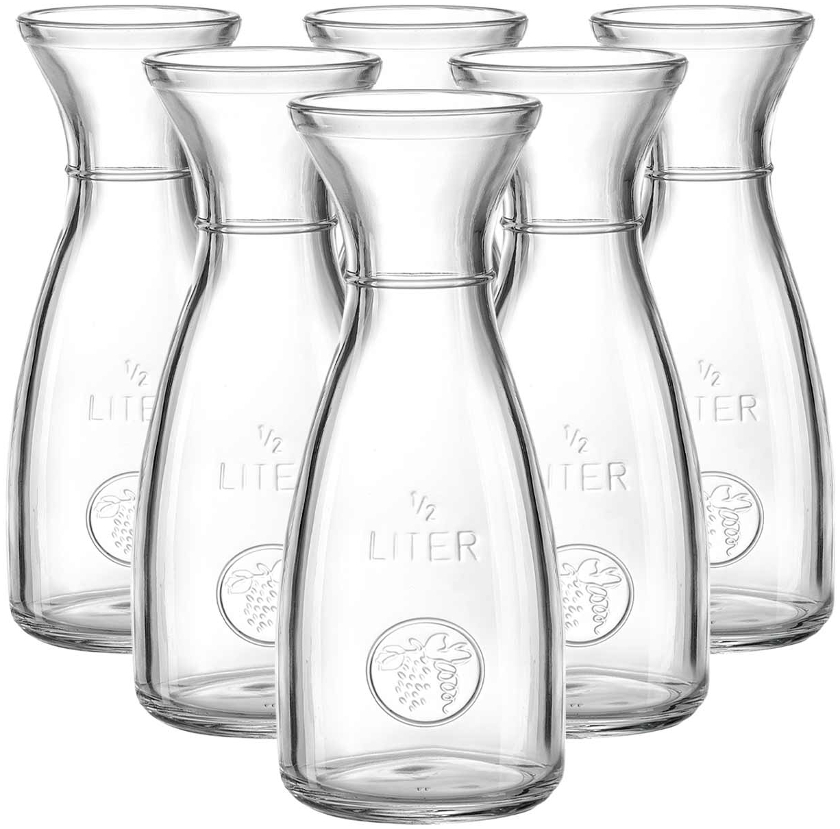 Charmantes 6er Set bordeauxfarbener Karaffen im Landhausstil. Mit einem Fassungsvermögen von 500 ml sind sie ideal für Tafel- und Landwein, Wasser, Schorle, Saft oder Eistee. Das dekorative Traubenmotiv ist dauerhaft ins Glas geprägt. Die Karaffen sind spülmaschinenfest und überzeugen durch ihre robuste Verarbeitung. **Highlights** - Charmanter Landhausstil für verschiedene Anlässe - Ideal zum Servieren von Tafel- und Landwein - Dekoratives, dauerhaft geprägtes Traubenmotiv - Spülmaschinenfest für einfache Reinigung - Robuste Verarbeitung für lange Haltbarkeit **Produkteigenschaften** - Durchmesser: ca. 9 cm - Höhe: ca. 21 cm - Inhalt: ca. 500 ml (strichvoll) - Material: Glas **Lieferumfang** - 6x Karaffe