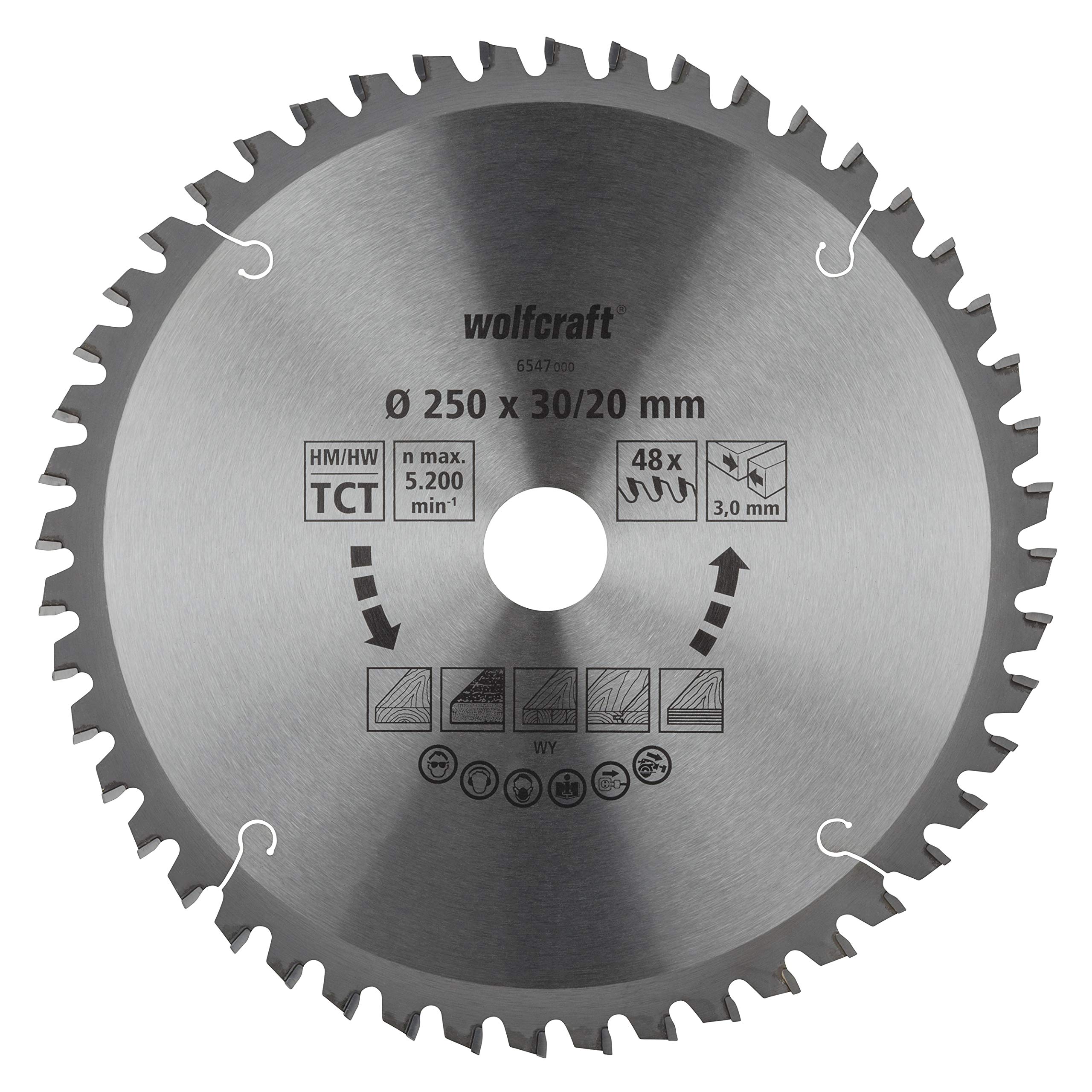 - Das wolfcraft 6547000 Kapp- und Gehrungssägeblatt hat einen Durchmesser von 250 mm