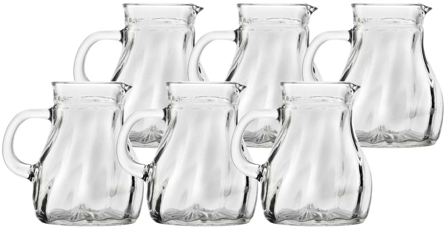 Der Stölzle Lausitz SALZBURG Krug 0,5 l im 6er Set überzeugt durch sein elegantes Design und hohe Stabilität. Die geschwungene Form, das Spiralrelief an der Außenwand und der Krugboden in Sternoptik machen ihn zu einem stilvollen Accessoire. Mit dem praktischen Henkel lässt sich der Krug ideal für Wasser, Saft oder Limonade nutzen. Zudem ist er spülmaschinengeeignet und somit besonders pflegeleicht. **Highlights** - Außergewöhnliches Design - Hohe Stabilität - Geschwungene Form - Spiralrelief an der Außenwand - Sternoptik-Krugboden **Produkteigenschaften** - Höhe: ca. 13,1 cm - Außendurchmesser: ca. 10,5 cm - Volumen: 0,5 l - Spülmaschinengeeignet **Lieferumfang** - 6x Krug