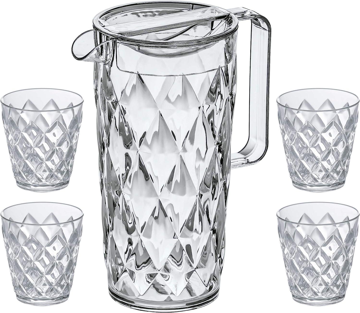 Koziol Crystal Kanne mit 4 BecherTrinkkanne, Trinkbecher, Wasserbecher, Saftkanne, Kunststoff, Crystal Clear, 1. 6 L, 4007535