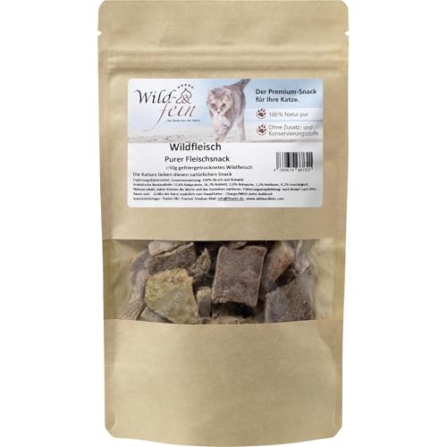 - Der Wild & Fein Wildfleischsnack für Katzen ist in einer 50 g Packung erhältlich und bietet einen schmackhaften Snack, der gefriergetrocknet ist