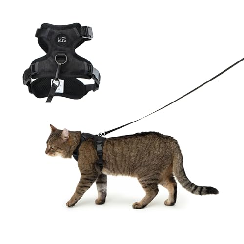 LucyBalu® Explorer Katzengeschirr mit Leineausbruchsicheres Brustgeschirr mit AirTag Fach, verstellbar, Schwarz M/L