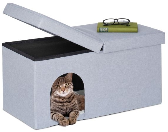 Katzenhöhle in Grau mit Deckel 10045089. Diese moderne Tierhöhle bietet Ihrer Katze einen gemütlichen Schlafplatz und einen sicheren Rückzugsort. Die großzügige Öffnung macht sie auch ideal für Welpen und kleine Hunde. Der stabile Katzenhocker kann dank des Deckels sowohl von Tieren als auch von Menschen als Sitzbank genutzt werden. Bei Nichtgebrauch lässt sich die Höhle einfach zusammenfalten und platzsparend verstauen. **Highlights** - Gemütlicher Schlafplatz für Katzen und kleine Hunde - Integrierte Sitzbank für Mensch und Tier - Faltbar für platzsparende Aufbewahrung - Modernes Design in ansprechenden Farben - Hohe Traglast von bis zu 150 kg **Produkteigenschaften** - Gesamtmaße H x B x T: ca. 38,5 x 74,5 x 37 cm - Faltmaße H x B x T: ca. 9,5 x 74,5 x 38 cm - Öffnung H x B: ca. 21x19 cm - Gewicht: ca. 5,8 kg - Material: MDF-Platten, Polyester, Schaumstoff - Farbe: Grau, Weiß, Schwarz **Lieferumfang** - 1x Katzenmöbel - Dekorationsartikel sind nicht im Lieferumfang enthalten