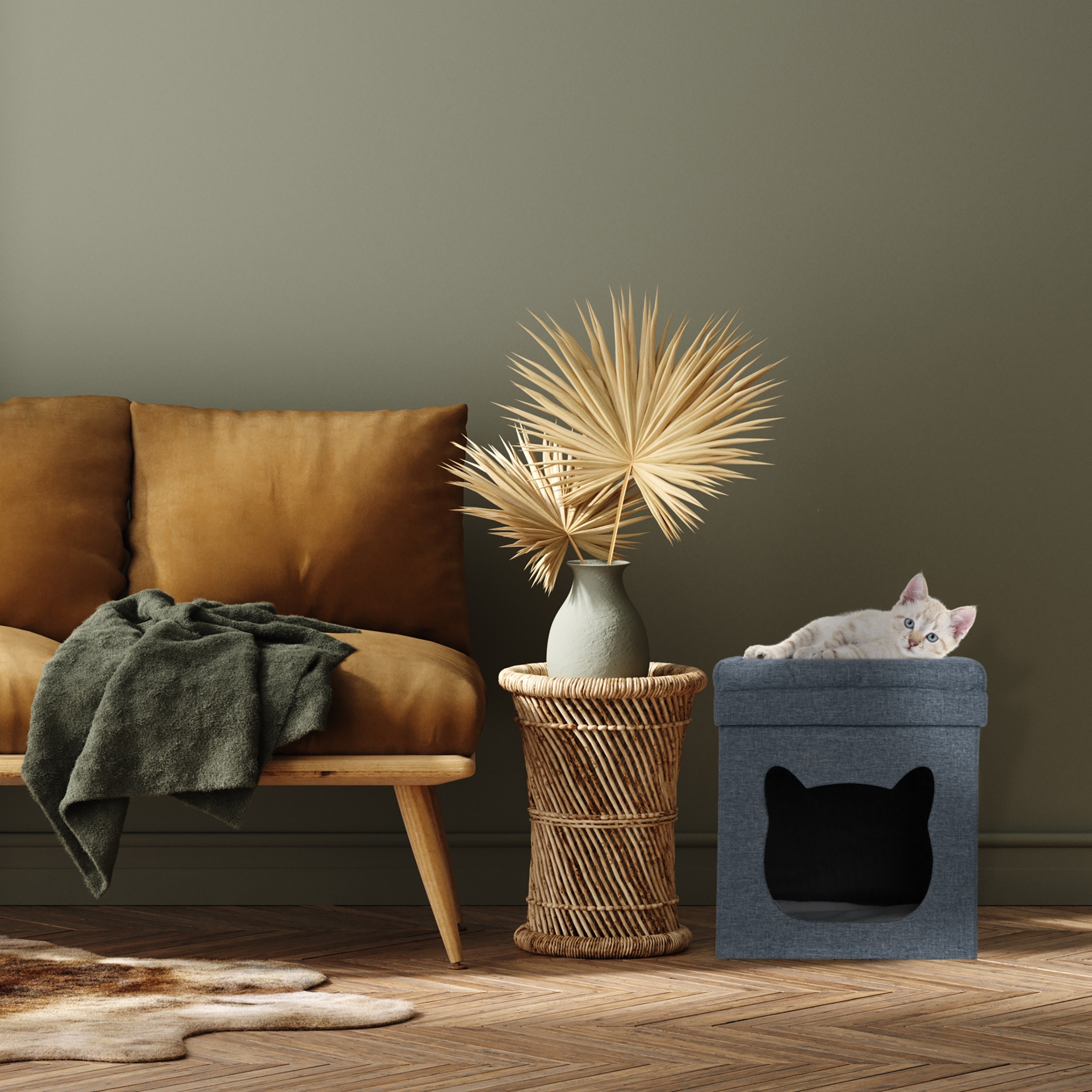 **Kuscheliger Katzenhocker mit Rückzugsort für Deine Samtpfote** Dieser gemütliche Katzenhocker könnte schnell zum Lieblingsplatz Deiner Samtpfote werden. Die Katze hat die Wahl zwischen zwei Etagen: Möchte sie sich zurückziehen, bietet die Katzenhöhle mit einem weichen Kissen die benötigte Ruhe. Will Deine Fellnase hingegen alles im Blick haben, kann sie es sich auf dem gepolsterten Sitzhocker gemütlich machen. Bei Nichtgebrauch lässt sich der Sitzwürfel einfach zusammenfalten und platzsparend verstauen. **Katzenhöhle im Detail:** - **Gesamtmaße (H x B x T):** ca. 44 x 40 x 40 cm - **Innenmaße (H x B x T):** ca. 34 x 36 x 36 cm - **Eingang (H x B):** ca. 20x25 cm - **Maße gefaltet (H x B x T):** ca. 10 x 40 x 40 cm - **Traglast:** max. 100 kg - **Gewicht:** ca. 3,1 kg - **Material:** MDF, Polyester, Schaumstoff - **Farbe:** Dunkelgrau, Weiß **Sitzhocker mit Katzenversteck:** - Gemütlicher Schlafplatz und Rückzugsort für Deine Katze - Weiche Liegeflächen in der Höhle und auf dem Dach - Großer Eingang, bequemes Kissen und abnehmbarer Deckel - Ideal als Sitzhocker mit Stauraum nutzbar - Kissen waschbar bis 40°C in der Maschine - Katzenwürfel lässt sich bei Bedarf einfach zusammenklappen und verstauen **Lieferumfang:** - 1x Katzenhocker - Dekorationsartikel sind nicht im Lieferumfang enthaltenDekorationsartikel sind nicht im Lieferumfang enthalten