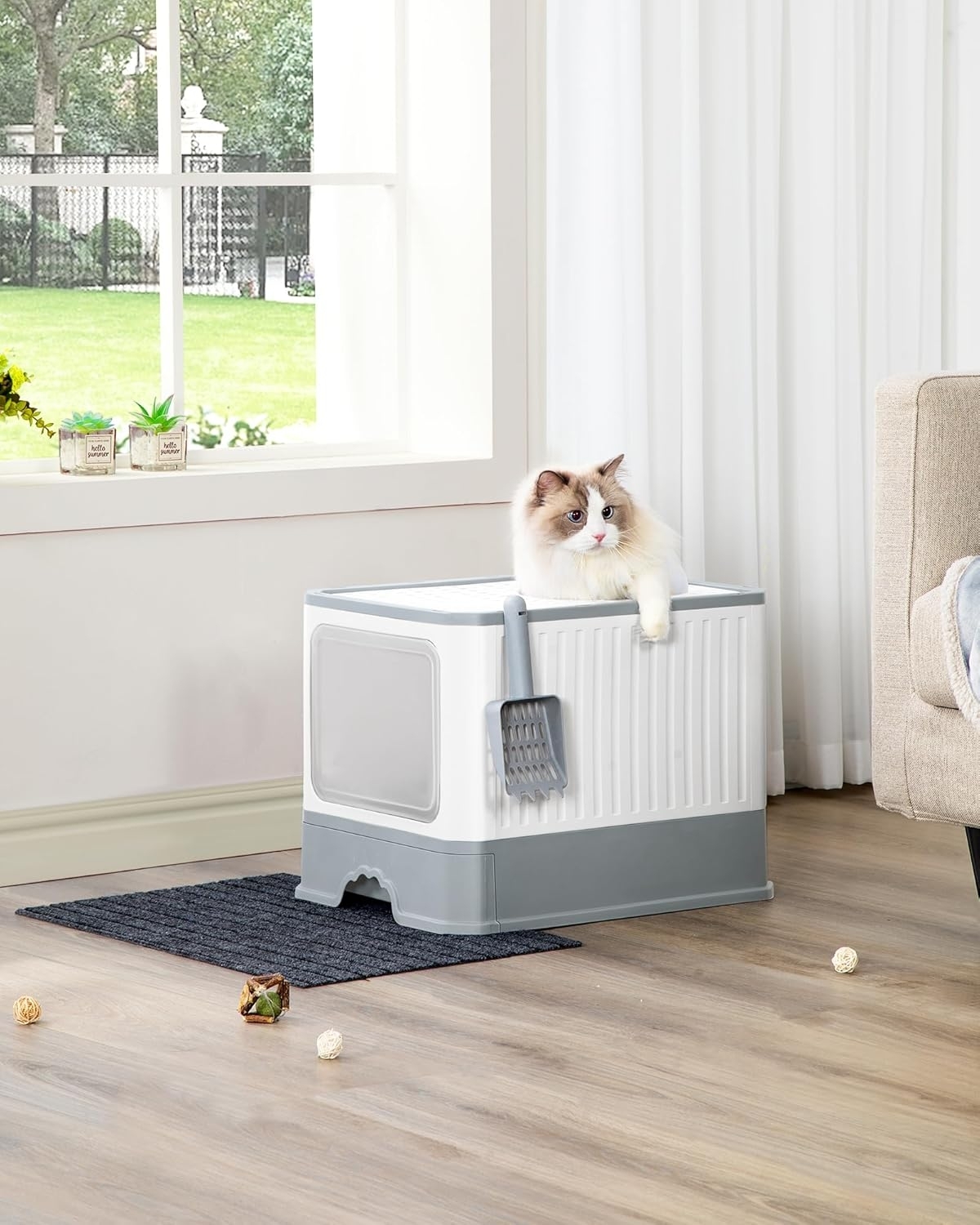 **Info zu diesem Artikel** 1. 2 Große Eingänge: Der vordere Eingang ist 27 x 21 cm groß und der obere Eingang hat einen Durchmesser von 19 cm, sodass auch größere Katzen problemlos durch diese beiden Eingänge ein- und ausgehen können. 2. Schützen Sie Ihren Boden: Legen Sie die Matte vor oder an die Seiten der Katzentoilette, um Streu aufzufangen, wenn Ihre Katze herausspringt. Oder legen Sie die Matte direkt unter die Katzentoilette, um zu verhindern, dass Urin ausläuft und den Boden verschmutzt. 3. Einfache Reinigung: Das Katzenklo verfügt über ein schubladenähnliches Design mit einem erhöhten Zylinder am Boden. Ziehen Sie einfach die Schublade am Boden der Katzentoilette leicht heraus, um die Katzenstreu leicht zu entfernen oder auszutauschen. 4. Weniger Schmutz: Das Gitterdesign oben reduziert die Spuren und lässt die Streu zurück in die Box fallen. Dadurch entsteht weniger Schmutz im Haus und hält Ihr Zuhause sauber. 5. Faltbar und demontierbar: Dank des klappbaren Designs und der leicht verständlichen Anleitung ist das neue Katzenmöbel Ihres Freundes in 5 Minuten oder weniger einsatzbereit! **Produktdetails:** * Farbe: Grau * Material: PP (Polypropylen), PC (Polycarbonate) * Größe: 38 x 37,5 x 51 cm (L x B x H) * Gewicht: 2.8 kg * Max. statische Belastbarkeit auf der Oberseite: 15 kg **Hinweise:** * Um Schäden zu vermeiden, sollten Sie das Produkt nicht grob zusammenbauen oder auseinandernehmen.