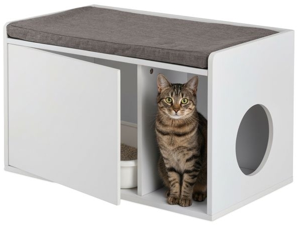 Auch Dein Stubentiger braucht seine Ruhe. Schaffe Deinem Haustier einen Rückzugsort im Bad, Schlaf- oder Wohnzimmer mit diesem schönen Katzenschränkchen, das aus einem geschlossenen und einem offenen Fach besteht. Hinter der Tür lässt sich ein Katzenklo oder Decken und Kissen platzieren. Über den runden Durchgang gelangt Deine Katze selbstständig hinein und wieder heraus. Praktischerweise kannst Du das Katzenzubehör auch als bequeme Sitzbank nutzen. Die clevere 2in1-Lösung für Tier und Mensch! **Katzenschrank im Detail** - Gesamtmaße H x B x T: ca. 45,5 x 75 x 43 cm - Runder Eingang D: ca. 20 cm - Geschlossenes Fach innen H x B x T: ca. 38 x 47,5 x 40 cm - Offenes Schrankfach innen H x B x T: ca. 38 x 23 x 40 cm - Durchgang zw. Fächern H x B: ca. 38x18 cm - Maße der Sitzfläche B x T: ca. 72x42 cm **Weitere Details zur Katzenkommode** - Gewicht: ca. 17,3 kg - Max. Traglast: ca. 200 kg - Material: MDF, Polyester, Schaumstoff - Farbe: Weiß, Grau Katzenklo Schrank für Deine Samtpfote - Katzentoilette kann im Schrank elegant versteckt werden - Gleichzeitig als Sitzbank für Herrchen und Frauchen nutzbar - Katze gelangt durch runden Eingang bequem hinein und heraus - Auch als Rückzugsort oder Schlafplatz verwendbar - In Bad, Flur, Wohn- oder Schlafzimmer platzieren - Dank der Tür ist der Innenraum leicht zu reinigen **Lieferumfang:** - 1x Katzenklomöbel in Einzelteilen - 1x Sitzkissen - Mit Montagematerial und Aufbauanleitung - Katzentoilette und Deko sind nicht im Lieferumfang enthalten (EAN: 4052025391256)