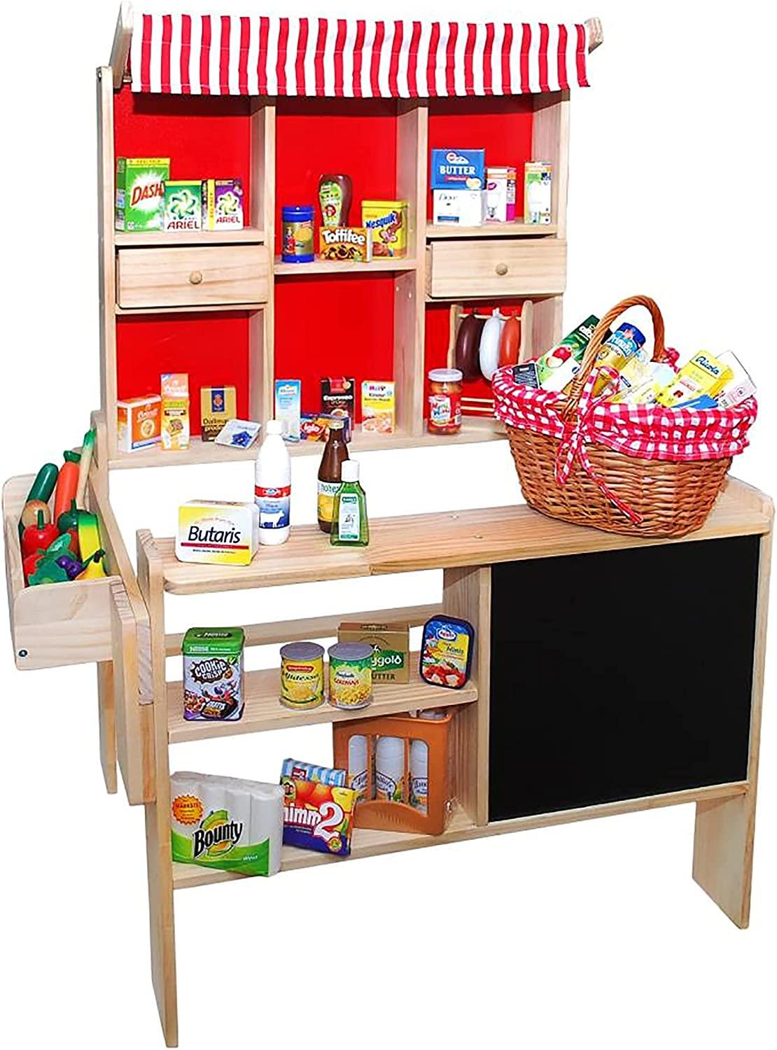 Der klassische Kaufladen ist ein unverzichtbares Spielzeug in jedem Kinderzimmer. Dieses Modell besteht aus Holz und ist mit liebevollen Details, wie einer Markise, ausgearbeitet. So befindet sich in der Front eine praktische Tafel, Fächer und Schubladen ergänzen den typischen Look eines Marktstand. Eine seitliche Theke und Ablageflächen bieten viel Platz zum Verstauen. Inkl. 40 Markenminiaturen zum selber Falten. Lieferung erfolgt ohne dem abgebildeten Korb. Die Lieferung der Marken-Miniaturen erfolgt sortiert. **Details:** - Mit Tafel - Inklusive 39 Miniaturfaltschachteln und einem Kunststoffteil (Beispiel: Nescafe, Volvic u.v.m) - Maße (L/B/H): 73 x 63 x 100 cm - Tresenhöhe: ca. 49 cm - Zubehör ist scannbar Achtung: Das abgebildete 40-teilige Zubehör variiert! Nicht für Kinder unter drei Jahren geeignet. Enthält Kleinteile, die verschluckt werden können. Erstickungsgefahr!