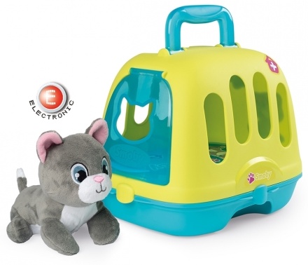 - Im Set ist eine weiche, hellgraue Stoffkatze enthalten, die bei Druck auf den Bauch schnurrt und miaut.