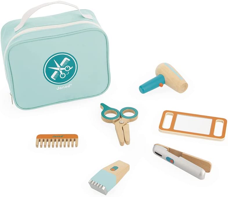 Janod - Friseurkoffer - Imitationsspiel für Berufe - incl. 6 Accessoires aus Holz - Regt die Fantasie an - FSC-zertifiziert - Farbe auf Wasserbasis - Ab 3 JahrenJ06549