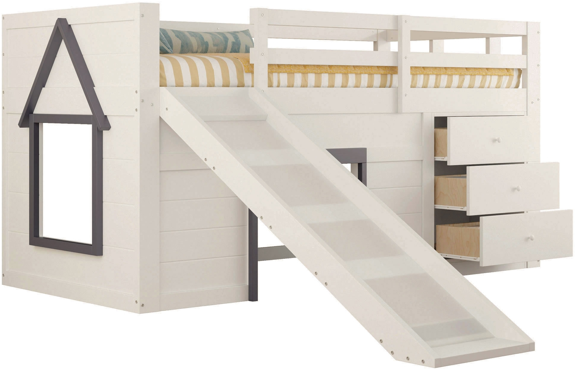 | Name | Merax Etagenbett Hochbett 90x200cm mit Rutsche, Kinderbett Hausbett mit 3 Schubladen, mit Rausfallschutz und Lattenrost, Stockbett Creme |