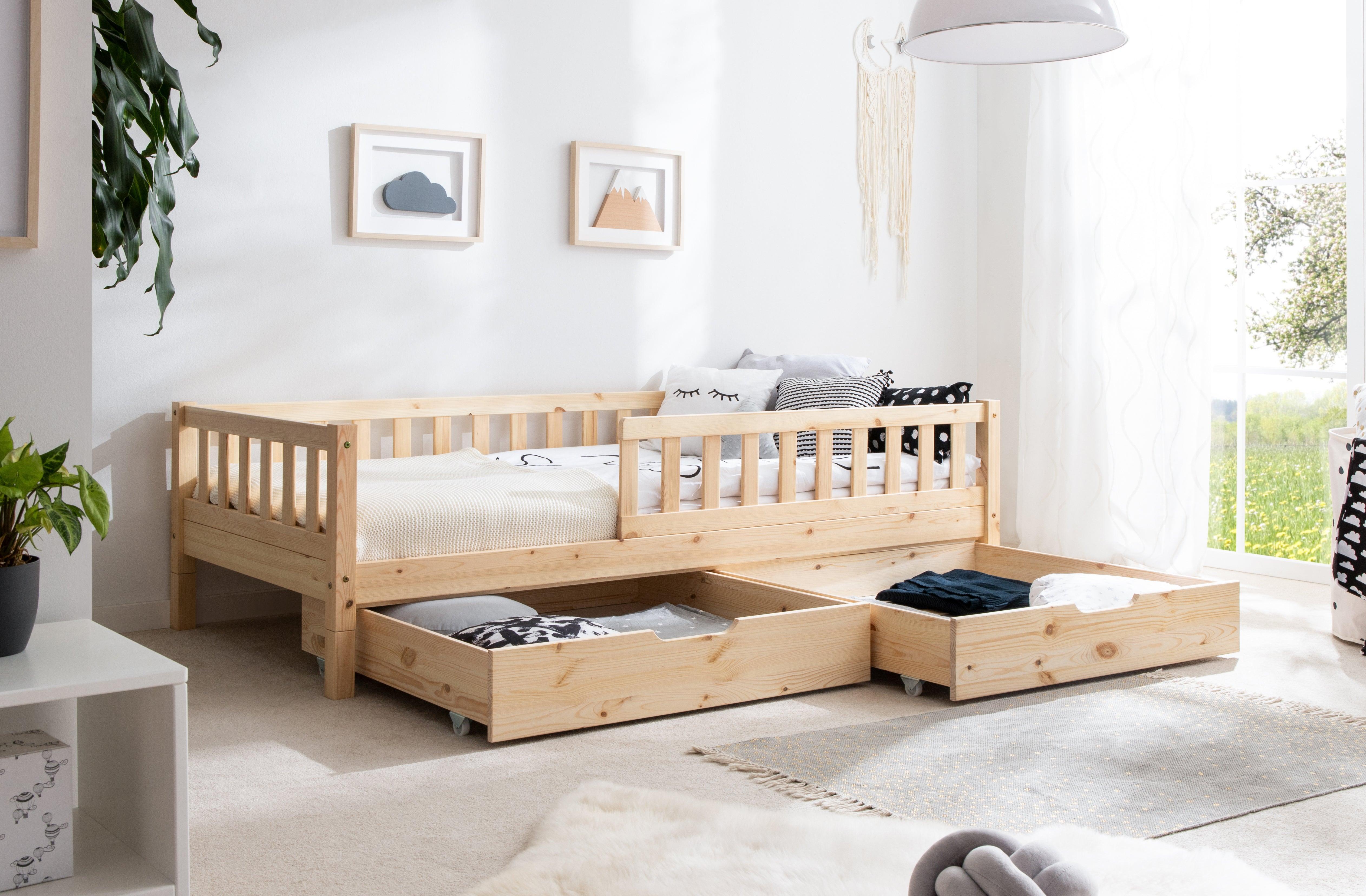 Das Bodenbett "Mio" ist ein flexibles Einzelbett in den Maßen 90 x 200 cm, das im Montessori-Stil gestaltet ist. Es bietet eine Höhenverstellbarkeit von 5 cm auf bis zu 21 cm und ist aus massivem Kiefernholz gefertigt. Mit abgerundeten Kanten und einem anpassbaren Rausfallschutz sorgt es für Sicherheit und Komfort. Das Bett lässt sich einfach in ein Funktionsbett umwandeln und bietet Platz für Schubkästen. **Highlights** - Höhenverstellbar von 5 cm auf 21 cm - Inklusive Rausfallschutz, der abmontierbar ist - Anschlagleiste verhindert das Verrutschen von Zubehör - Aus massivem Kiefernholz mit abgerundeten Kanten - Flexibles Design für verschiedene Familienbedürfnisse **Produkteigenschaften** - Liegefläche: 90 x 200 cm - Abmessungen: Breite 97 cm, Länge 208 cm, Höhe 60 cm oder 44 cm (höhenverstellbar) - Bodenfreiheit: 5 cm oder 21 cm (höhenverstellbar) - Einlegetiefe: 6 cm - Material: Kiefer-Massivholz **Lieferumfang** - Bodenbett - Rollrost mit Federleisten - Rausfallschutz - Füße für Höhenverstellung - Montagematerial und Montageanleitung - Ohne Dekoration - Zubehör separat erhältlich: 2er Schubkasten oder Bettkasten, Matratze, Sichtschutz Blende