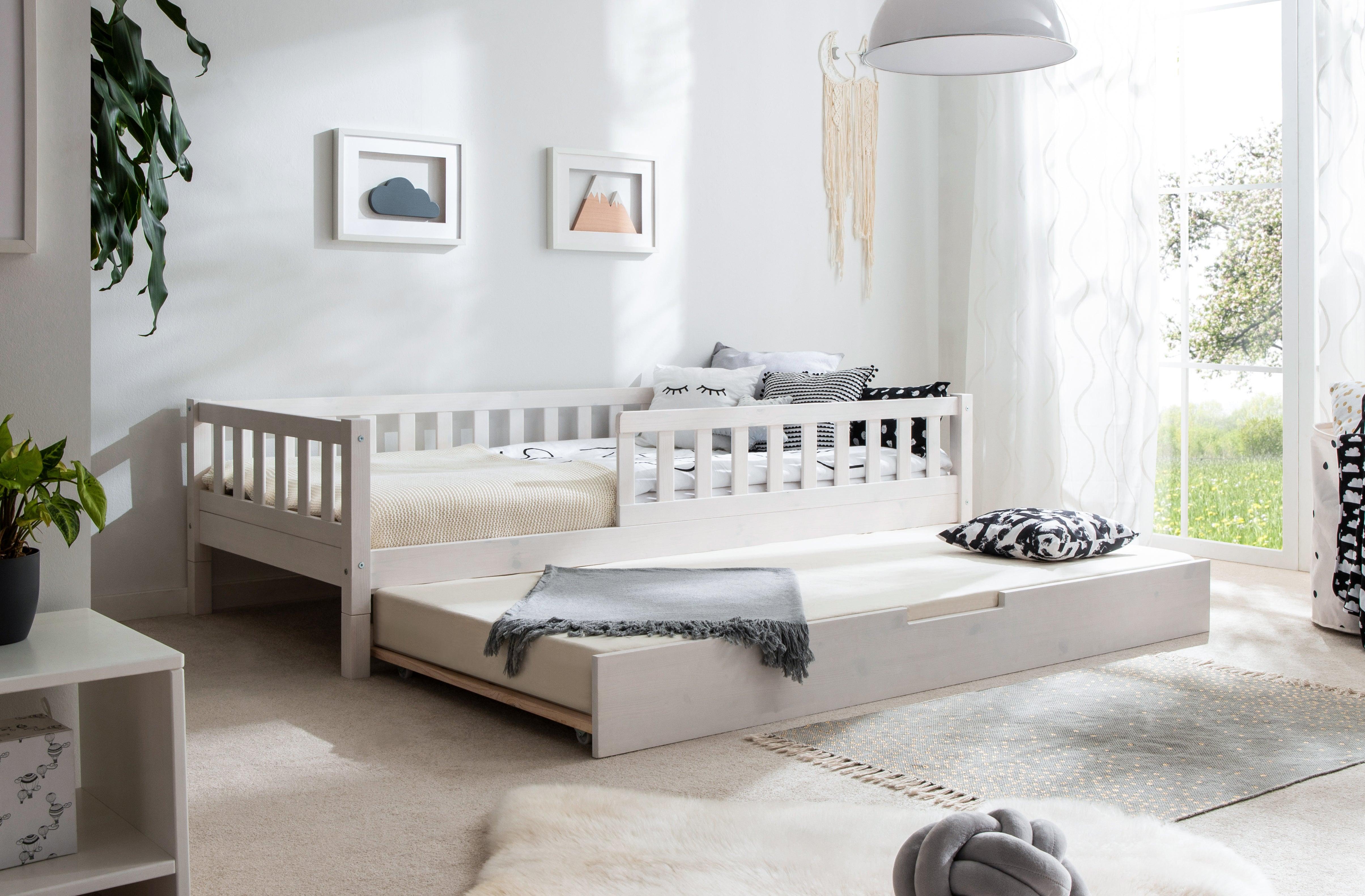 Das Bodenbett Einzelbett "Mio" in den Maßen 90 x 200 cm aus massivem Kiefernholz bietet ein mitwachsendes Design, das sich flexibel an die Bedürfnisse Ihres Kindes anpasst. Mit einer Höhenverstellbarkeit von 5 cm auf 21 cm und einem anpassbaren Rausfallschutz sorgt es für Sicherheit und Komfort. Das Bett lässt sich einfach in ein Funktionsbett umwandeln und bietet Platz für Schubkästen. **Highlights** - Höhenverstellbar von 5 cm auf 21 cm für individuelle Anpassung - Inklusive Rausfallschutz, der abnehmbar ist - Anschlagleiste verhindert das Verrutschen von Zubehör - Aus massivem Kiefernholz mit abgerundeten Kanten für maximale Sicherheit - Funktionalität durch Umbaumöglichkeiten zu einem Funktionsbett **Produkteigenschaften** - Liegefläche: 90 x 200 cm - Abmessungen: Breite 97 cm, Länge 208 cm, Höhe 60 cm oder 44 cm (höhenverstellbar) - Bodenfreiheit: 5 cm oder 21 cm (höhenverstellbar) - Einlegetiefe: 6 cm - Material: Kiefer-Massivholz **Lieferumfang** - Bodenbett - Rollrost mit Federleisten - Rausfallschutz - Füße für Höhenverstellung - Montagematerial und Montageanleitung - Ohne Dekoration - Zubehör separat erhältlich: 2er Schubkasten oder Bettkasten, Matratze, Sichtschutz Blende