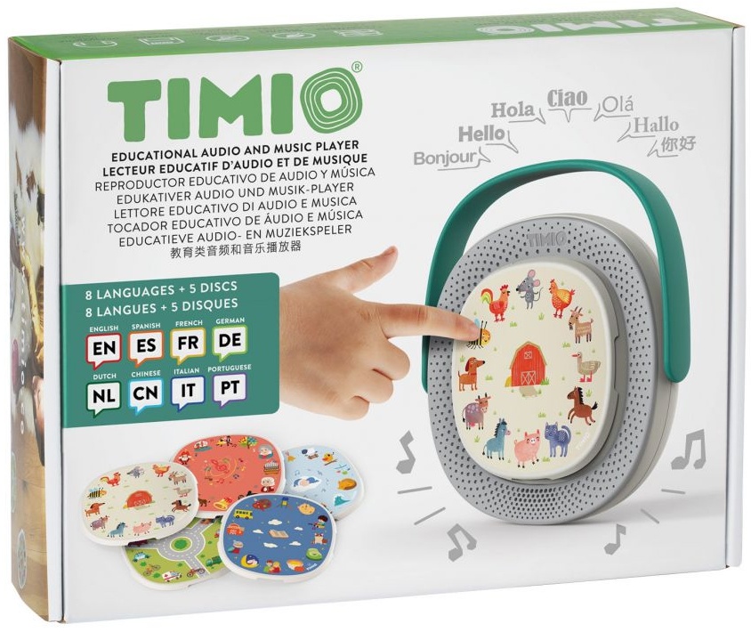 TIMIO ist ein interaktiver und lehrreicher Audio- Player für Vorschulkinder mit einfacher Bedienung: das Kind wählt eine Disc aus, legt sie auf TIMIO und tippt auf ein Bild. Schöne und farbenfrohe Gestaltung mit liebevollen detaillierten Illustrationen, sowie Licht- und Soundeffekten, was besonders Lust auf das Spielen macht. TIMIO verwendet magnetische Discs, um eine große Bibliothek mit ausgewählten Inhalten freizuschalten, die mit dem Kind mitwächst, von Kinderliedern und Schlafliedern bis hin zu Geschichten, Vokabeln und vieles mehr. Alles in 8 verschiedenen Sprachen: Englisch, Spanisch, Französisch, Deutsch, Niederländisch, Chinesisch (Mandarin), Italienisch und Portugiesisch. Mit dem ein- und ausschaltbaren Quiz-Modus stellt TIMIO Fragen und diese Interaktivität verstärkt den Lernprozess. Da es keine bewegenden Bilder gibt, konzentriert sich das Kind auf die Stimme und Geräusche. Das LED-Licht und die Abbildungen verbessern das visuelle Erlebnis. Das Wechseln der Discs stimuliert die Motorik. Das Starter-Kit Timio kommt mit 5 magnetischen Audio-Discs mit Gute-Nacht-Geschichten, Weihnachts- und Schlaflieder, sowie Fahrzeug- und Bauernhoftierlauten. Ideal für Unterwegs mit dem tragbaren ergonomischen Griff und Kopfhöranschluss. Inbegriffen ist auch eine praktische Disc-Aufbewahrungstasche und eine Bedienungsanleitung. Warnhinweis: WARNING: Ziehen Sie die SD-Karte NICHT aus dem Batteriefach. TIMIO funktioniert ohne die SD-Karte nicht. Nicht für Kindern unter 2 Jahren geeignet. Halten Sie TIMIO von direkter Sonneneinstrahlung und übermäßiger Hitze fern. Der Temperaturbereich für den Warnhinweis: Achtung! Nicht für Kinder unter 36 Monaten geeignet. Achtung! Enthält verschluckbare Kleinteile. Erstickungsgefahr.