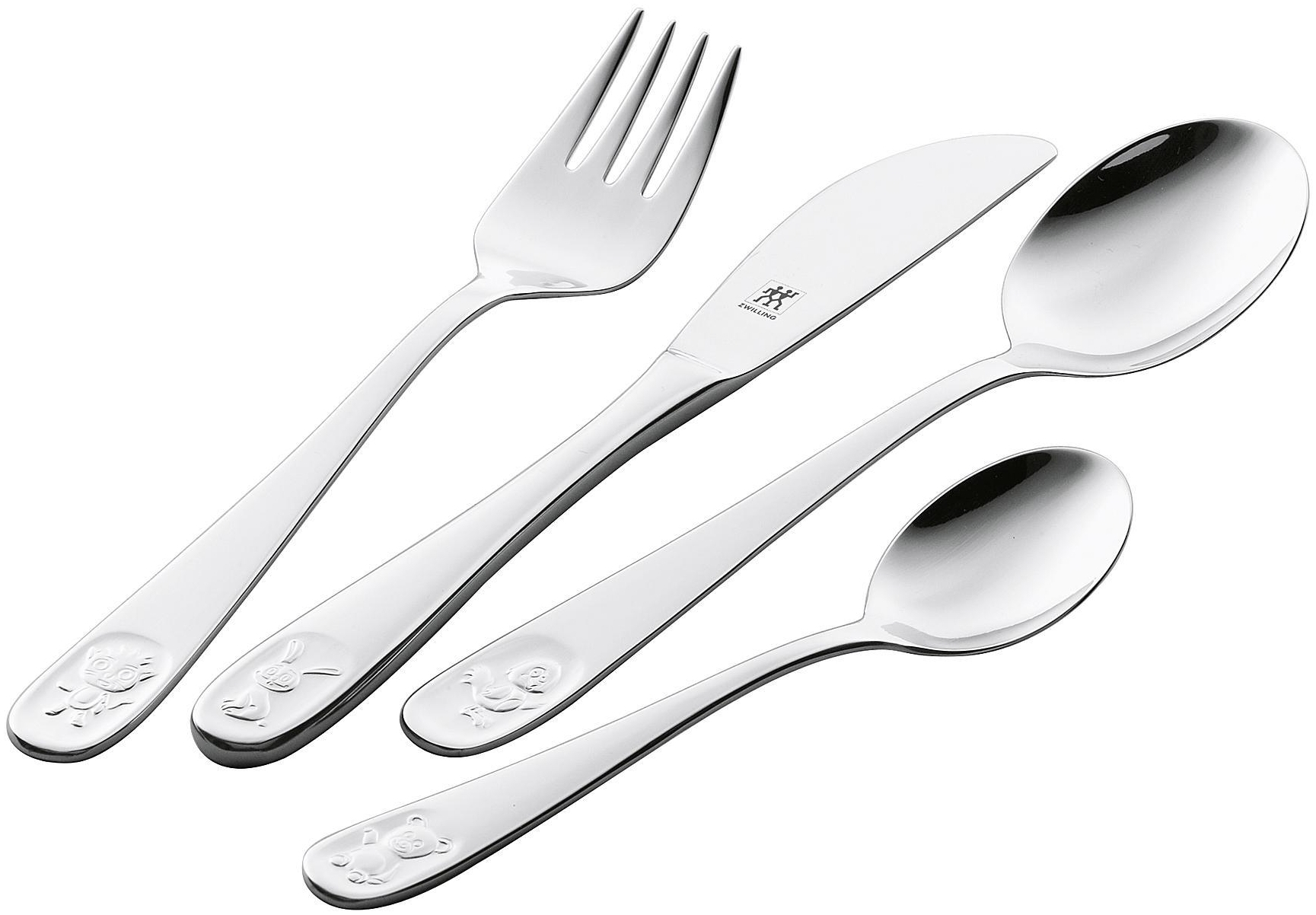 Das Zwilling Kinderbesteck-Set (4-tlg) aus hochwertigem 18/10 Edelstahl ist ideal für Kinder ab 3 Jahren. Mit abgerundeten Gabelspitzen und einem stumpfen Messer bietet es Sicherheit beim Essen. Die lustigen Tiermotive auf den Griffen fördern die Fantasie und machen das Essen zu einem spaßigen Erlebnis. Das Besteckset ist strapazierfähig, hitzebeständig und spülmaschinengeeignet, was die Reinigung erleichtert. **Highlights** - Kinderfreundliches Design mit spielerischen Tiermotiven - Abgerundete Gabelspitzen für sichere Nutzung - Stumpfes Messer für mehr Sicherheit - Hitzebeständig und strapazierfähig - Spülmaschinengeeignet für einfache Reinigung **Produkteigenschaften** - Material: 100 % Edelstahl - Edelstahl-Qualität: 18/10 - Maße: speziell für kleine Hände entwickelt - Geeignet für Kinder ab 3 Jahren **Lieferumfang** - 1 x Messer - 1 x Gabel - 1 x Esslöffel - 1 x Teelöffel