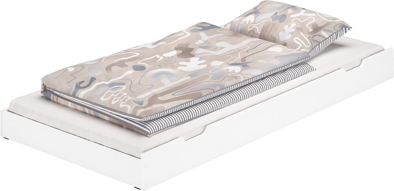 Der Bettkasten aus massiver Kiefer in Weiß dient als praktisches Zusatzbett für unsere Etagenbetten mit einer Liegefläche von 80x190 cm. Er ist stabil und pflegeleicht, da die Front und Seiten der Schubfächer weiß lackiert sind. Inklusive einer Rollmatratze mit einem Härtegrad von H2 und einem Lattenrollrost bietet er optimalen Schlafkomfort. **Highlights** - Stabile Ausführung aus massiver Kiefer - Pflegeleichte, weiß lackierte Oberfläche - Inklusive Lattenrollrost - Inklusive Rollmatratze RG 26, Härtegrad H2 - Passt unter Etagenbetten mit Liegefläche 80x190 cm **Produkteigenschaften** - Außenmaße: 184,5 x 84 x 16,5 cm - Liegefläche/Matratzenmaß: 80x180 cm (B/L) - Höhe der Matratze: ca. 11 cm - Boden mit Lattenrollrost - Bettkasten läuft leicht auf Kufen **Lieferumfang** - 1 Bettkasten - 1 Lattenrollrost - 1 Matratze - (ohne Deko)