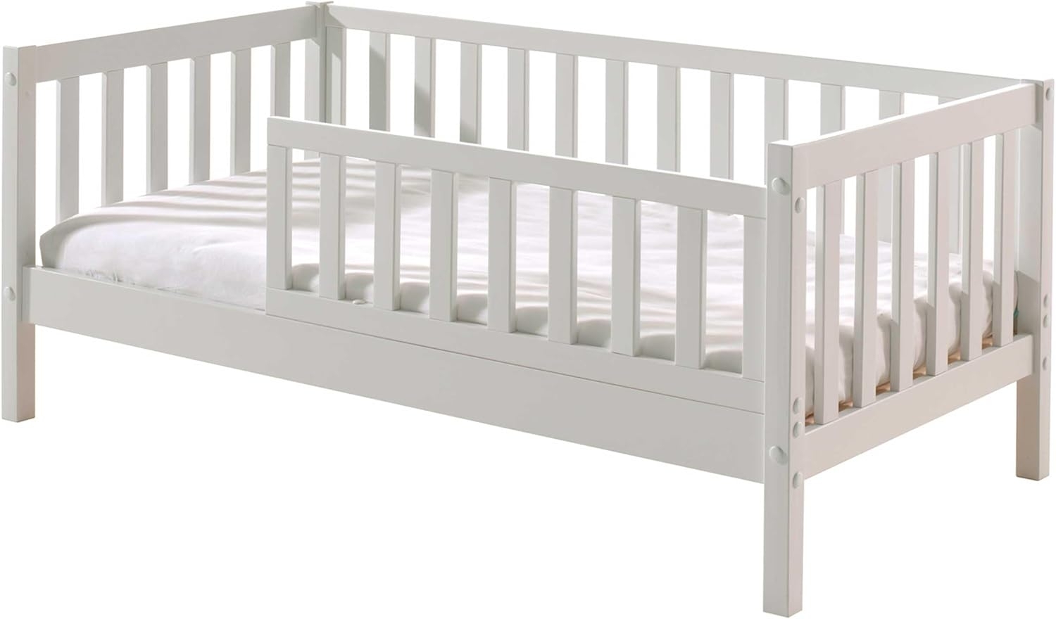Dieses Juniorbett ist eine ideale Zwischenlösung für Ihr Kind, wenn es schon eigenständig aufsteht. Trotzdem ist es durch die Sprossen des Rausfallschutzes in der Nacht geschützt. Hier hat jedes Kind Freude daran und das Bett lädt zum Träumen und kuscheln ein. Die Liegefläche ist 70x140 cm. Ein Rolllattenrost mit 11 Leisten gehört bereits zum Lieferumfang dazu. Der Korpus ist aus Kiefer massiv, weiß lackiert und durch die 40x40 mm starken Pfosten sehr standfest. Der umlaufende Rausfallschutz, mit senkrecht verlaufenden Sprossen, hat eine Höhe vom Boden bis Gitter Oberkante von ca. 60 cm. Vorne am Durchlass ist es ca. 54 cm hoch. Der Einstieg ins Bett ist ca. 52 cm breit, bei einer Einstiegshöhe von ca. 25 cm. Je nach Montage kann der Einstieg rechts oder links erfolgen. Das Bett hat eine Bodenfreiheit von ca. 16 cm. Für die Matratze steht eine Einlegetiefe von ca. 5 cm zur Verfügung. Die Matratze sowie die Deko gehören nicht zum Lieferumfang. Die Ware ist zerlegt, mit Montageanleitung zur einfachen Selbstmontage. Für Kinder unter 4 Jahre ist der Artikel nicht geeignet. Stellfläche Juniorbett ca.: B: 148 x H: 60 x T: 76 cm.