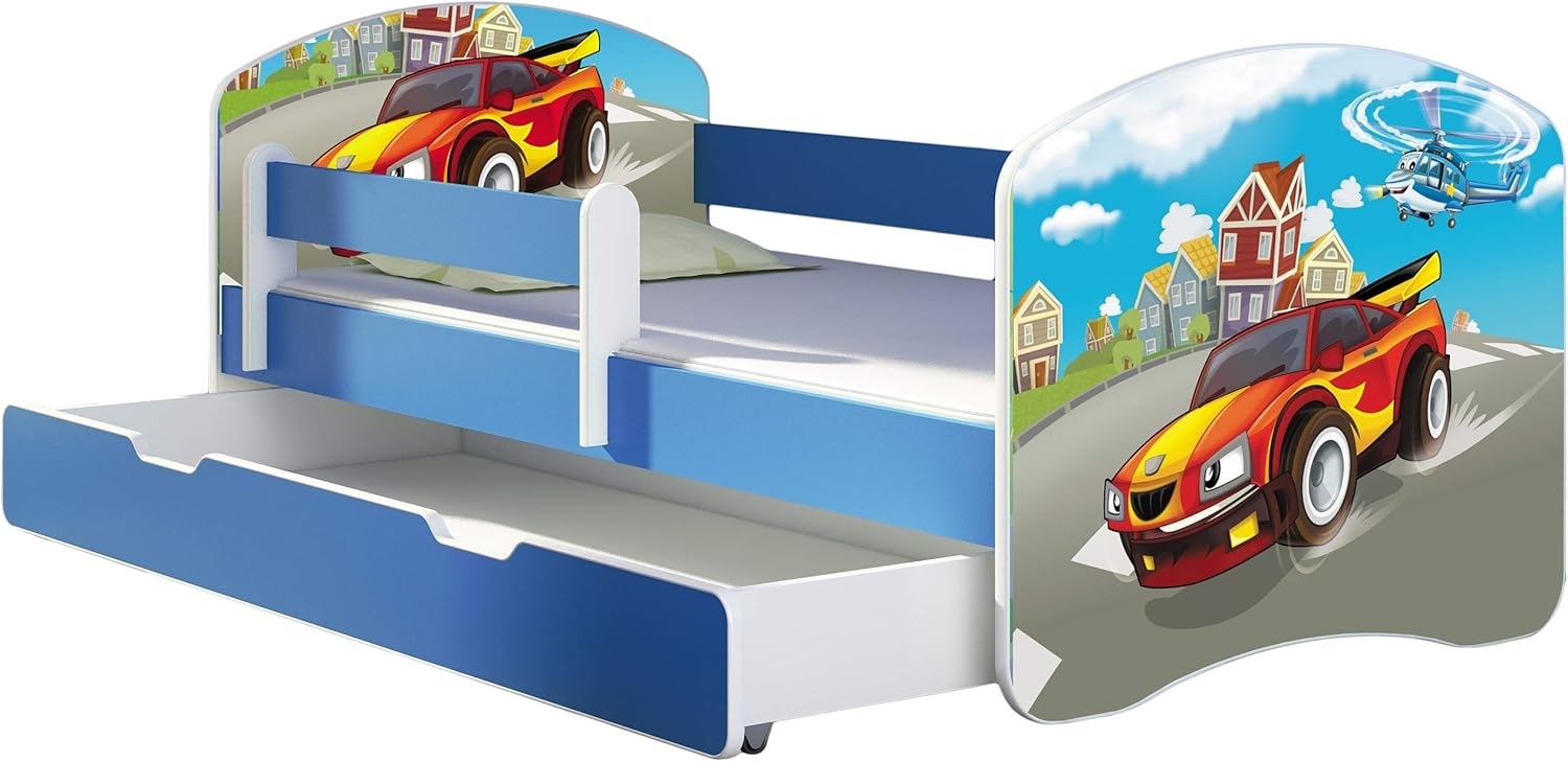 ACMA Kinderbett Jugendbett mit Einer Schublade und Matratze Blau mit Rausfallschutz Lattenrost II 140x70 160x80 180x80 (03 Racing Car, 140x70 + Bettkasten)