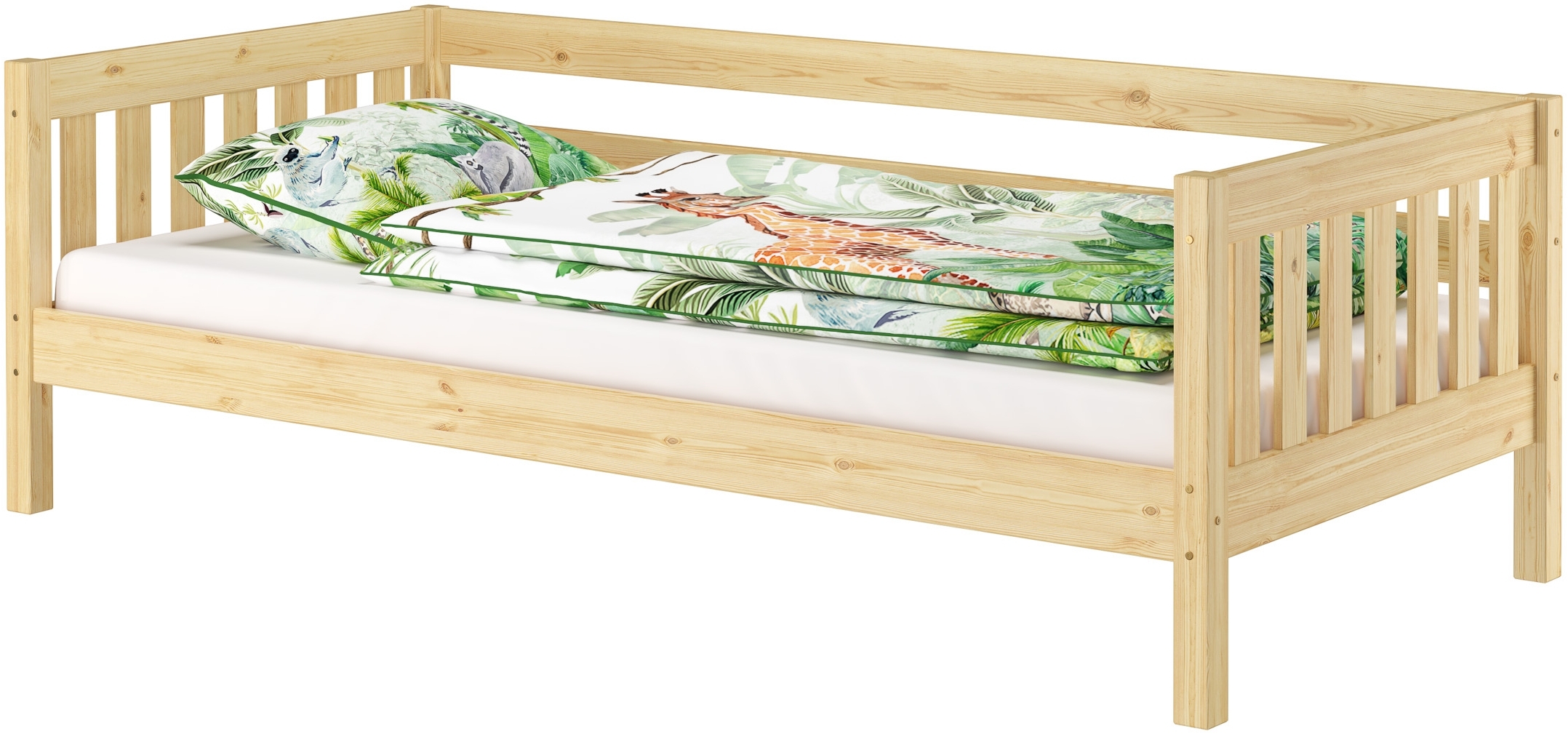 Gemütliches Kinderbett aus massivem Kiefernholz mit dreiseitiger Sicherung. Die Liegefläche beträgt 90x200 cm. Mit einer Höhe von ca. 61 cm und einer Sitzkante von ca. 30 cm ist es ideal für kleine Kinder. Die Tragkraft liegt bei ca. 90 kg bis 100 kg. Das Bett ist pflegeleicht, farblos lackiert und überzeugt durch eine lebendige Maserung. Alle Teile sind einfach zu montieren und werden mit Schraubensatz sowie Montageanleitung geliefert. **Highlights** - Dreiseitige Sicherung für mehr Sicherheit - Niedrige Sitzhöhe von ca. 30 cm für einfaches Einsteigen - Massives Kiefernholz, farblos lackiert für Pflegeleichtigkeit - Einfache Montage mit beiliegendem Schraubensatz und Anleitung - Tragkraft von ca. 90 kg bis 100 kg **Produkteigenschaften** - Liegefläche: 90x200 cm - Höhe: ca. 61 cm - Aufstellmaße: ca. 208x98,5 cm - Sitzkante: ca. 30 cm - Einlegetiefe: ca. 8,5 cm - Unterbetthöhe: ca. 19 cm **Lieferumfang** - Kinderbett ohne Zubehör - Schraubensatz und Montageanleitung