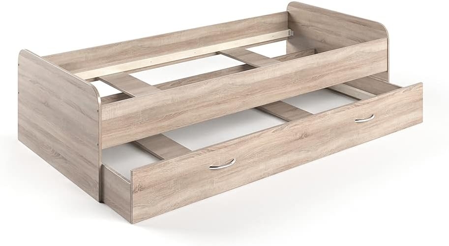 VitaliSpa Kinderbett Enzo ist ein hochwertiges Jugendbett mit einer Gästeliege, das sich ideal für das Kinderzimmer eignet. Mit den Abmessungen von 90 x 200 cm bietet es ausreichend Platz für erholsamen Schlaf. Das stilvolle Design aus Sonoma-Naturholz sorgt für Langlebigkeit und Stabilität. Die einfache Montage wird durch die beiliegende bebilderte Anleitung unterstützt. **Highlights** - Gästeliege für zusätzlichen Schlafplatz - Modernes Design aus Naturholz - Langlebige und formschöne Materialien - Einfache Montage durch bebilderte Anleitung - Vielseitig einsetzbar in verschiedenen Kinderzimmern **Produkteigenschaften** - Abmessungen: 90 x 200 cm - Maße (BxHxT): 90 x 52 x 200 cm - Material: Spanplatte, 16 mm - Oberfläche: Melaminharzbeschichtung - Gewicht brutto: 53,3 kg - Artikelgewicht inkl. Verpackung: 49,5 kg - Artikelgewicht: 47,52 kg **Lieferumfang** - VitaliSpa Bett Enzo - Bebilderte Montageanleitung - Montagematerial