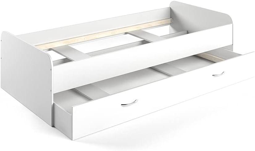 Das VitaliSpa Kinderbett Enzo in Weiß ist ein hochwertiges Jugendbett mit einer Gästeliege, das sich ideal für das Kinderzimmer eignet. Mit den Abmessungen von 90 x 200 cm bietet es ausreichend Platz für erholsamen Schlaf. Das stilvolle Design aus pflegeleichter Spanplatte mit Melaminharzbeschichtung sorgt für Langlebigkeit und Stabilität. Die einfache Montage wird durch die beiliegende bebilderte Anleitung unterstützt. **Highlights** - Gästeliege für zusätzlichen Schlafplatz - Modernes Design aus Naturholz - Langlebige und formschöne Materialien - Einfache Montage durch bebilderte Anleitung - Vielseitig einsetzbar in verschiedenen Kinderzimmern **Produkteigenschaften** - Abmessungen: 90 x 200 cm - Farbe: Weiß - Material: Spanplatte, 16 mm - Höhe: 52,4 cm - Artikelgewicht: 47,52 kg **Lieferumfang** - VitaliSpa Bett Enzo - Bebilderte Montageanleitung - Montagematerial