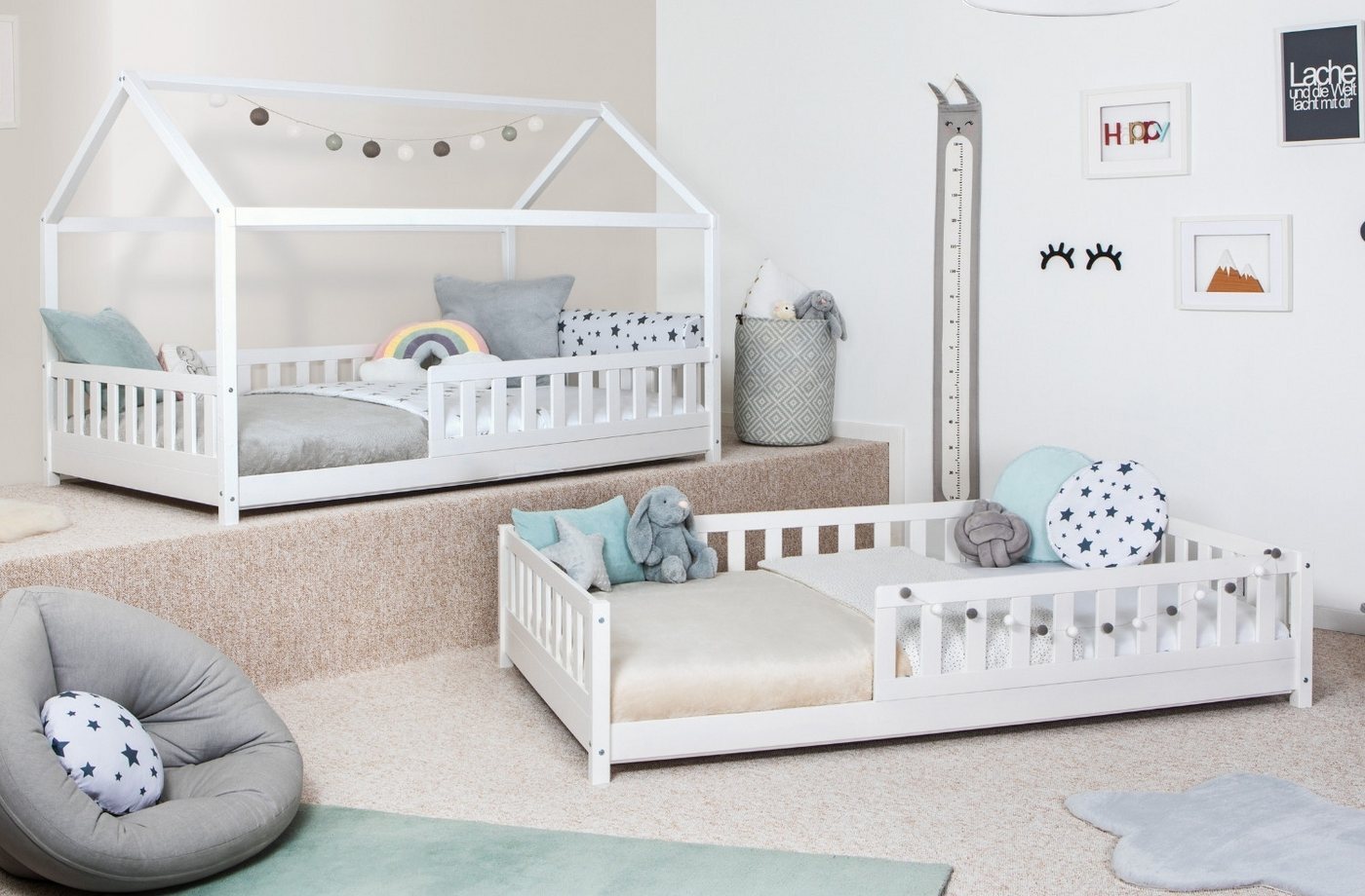 2-in-1 Hausbett Bodenbett „Duo“ Ein Bett – zwei Möglichkeiten Das charmante Hausbett „Duo“ mit einem abnehmbaren Dach ist die ideale Lösung für kleine Abenteurer und große Entdecker. Es wächst mit deinem Kind mit und verwandelt sich vom sicheren Kinderbett mit Rausfallschutz und spielerischem Dach, zu einem stilvollen Jugendbett. Die einzigartige Konstruktion erlaubt es, das Hausbett nach den Wünschen und dem wechselnden Geschmack deines Kindes anzupassen. „Duo“ gibt es in drei verschiedenen Farben: Natur, Weiß und Hellgrau und wird in 4 verschiedenen Größen angeboten. Das 2-in-1 Hausbett bietet mehr als nur eine Schlafgelegenheit. Es kann mühelos von einem bodennahen Hausbett mit Dach zu einem höhergestellten Jugendbett ohne Dachkonstruktion umgebaut werden und bietet zudem die Möglichkeit, den Rausfallschutz komplett zu entfernen. Dieses Hausbett besteht aus robustem Massivholz mit abgerundeten Kanten für maximale Sicherheit. In den Farben Weiß und Hellgrau wurde das Bett mit einem Lack auf Wasserbasis behandelt, der geruchsarm und besonders schonend zur Umwelt ist. Die Variante Natur ist dagegen unbehandelt geblieben. Das Kinderbett verfügt über einen abnehmbaren Rausfallschutz, der je nach Bedarf links oder rechts angebracht werden kann. Besonderheiten • 2-in-1 Kinderbett • Hausbett mit abnehmbarem Dachaufbau • Wandelbar zum Einzelbett • Dach: abnehmbare Vorderleiste • Inkl. Rausfallschutz • Inkl. Rollrost • höhenverstellbar • bodennah • Aus massiver Kiefer Produktmerkmale • Wandelbar zum Einzelbett • Dach: abnehmbare Vorderleiste • Inkl. Rausfallschutz • Inkl. Rollrost • Höhenverstellbar • Aus massiver Kiefer • Bodennahes Kinderbett Material • Kiefer-Massivholz Lieferumfang • 1 x Kinderbett, inkl. Umbau-Set für Hausbett oder Bodenbett-Variante • Rollrost • Montagematerial und Anleitung • Ohne Dekoration • Matratze separat erhältlich