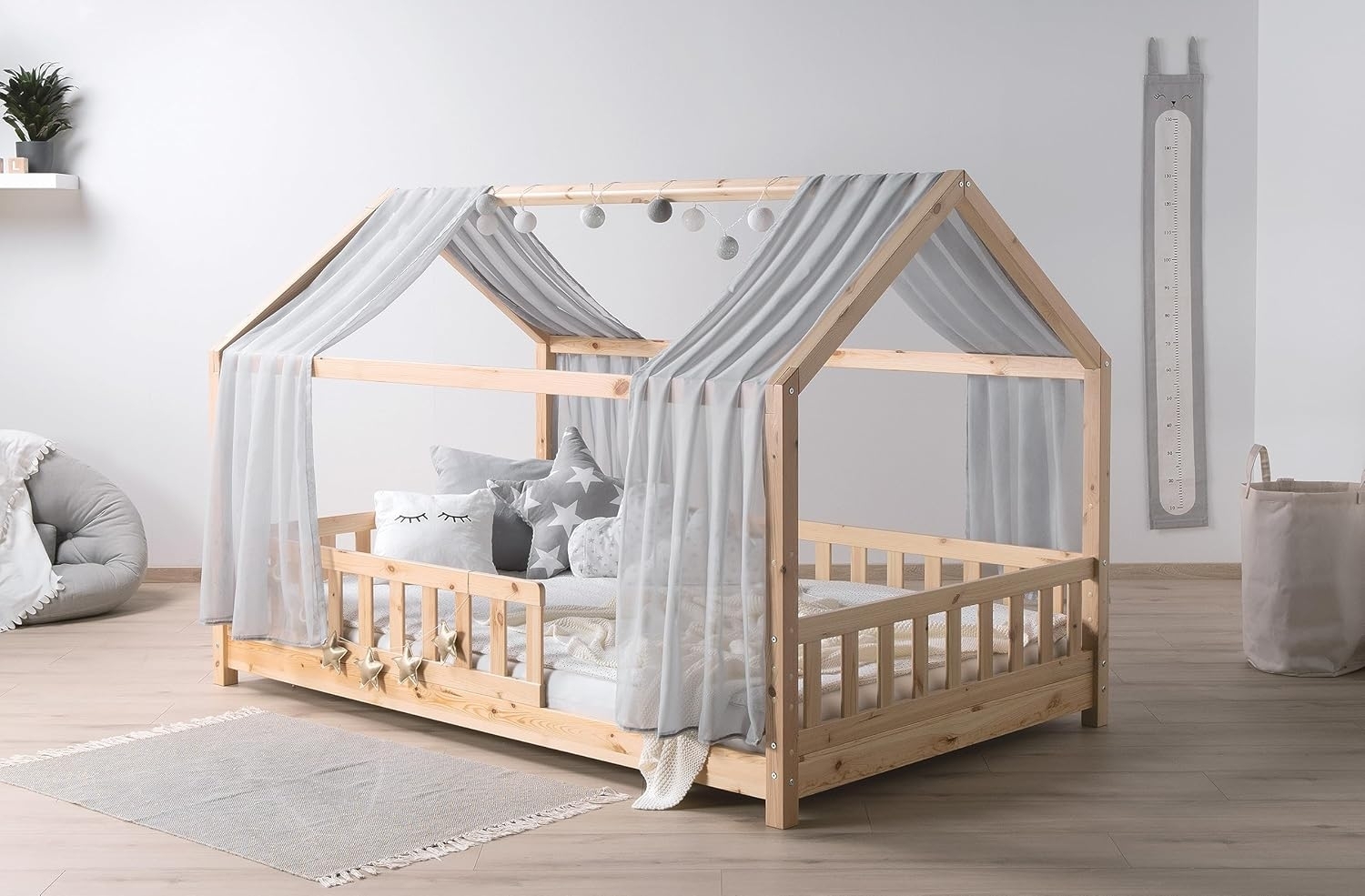 | Name | TiCAA Kinderbett Hausbett mit Tüll Kim 90x200 cm, 100x200 cm, 120x200 cm, 140x200 für Jungen & Mädchen, inkl. Rolllattenrost, Rausfallschutz variabel, Montessori Bett Natur aus Kiefer Massivholz |