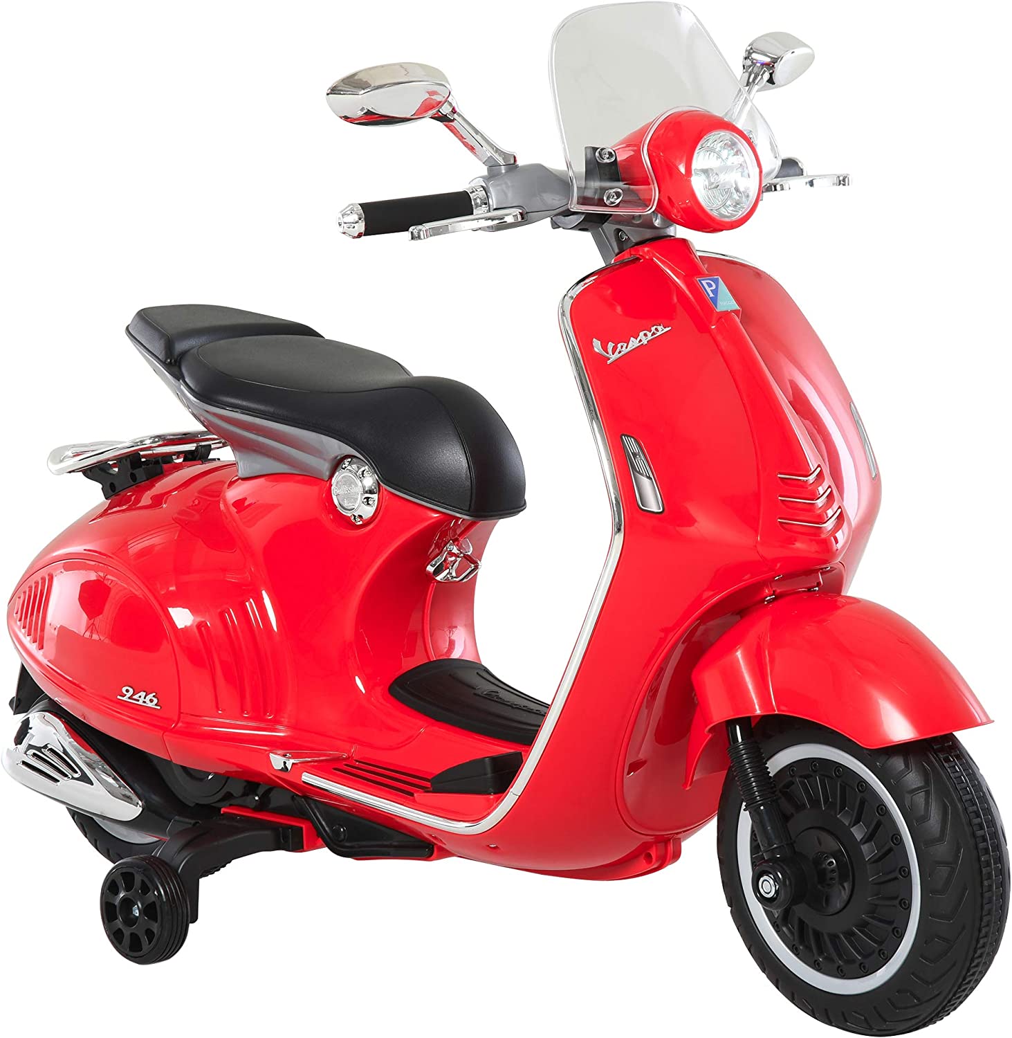 - Das elektrische Kindermotorrad ist ein lizenziertes VESPA-Modell mit einem einzigartigen, stromlinienförmigen Design in der Farbe Rot.