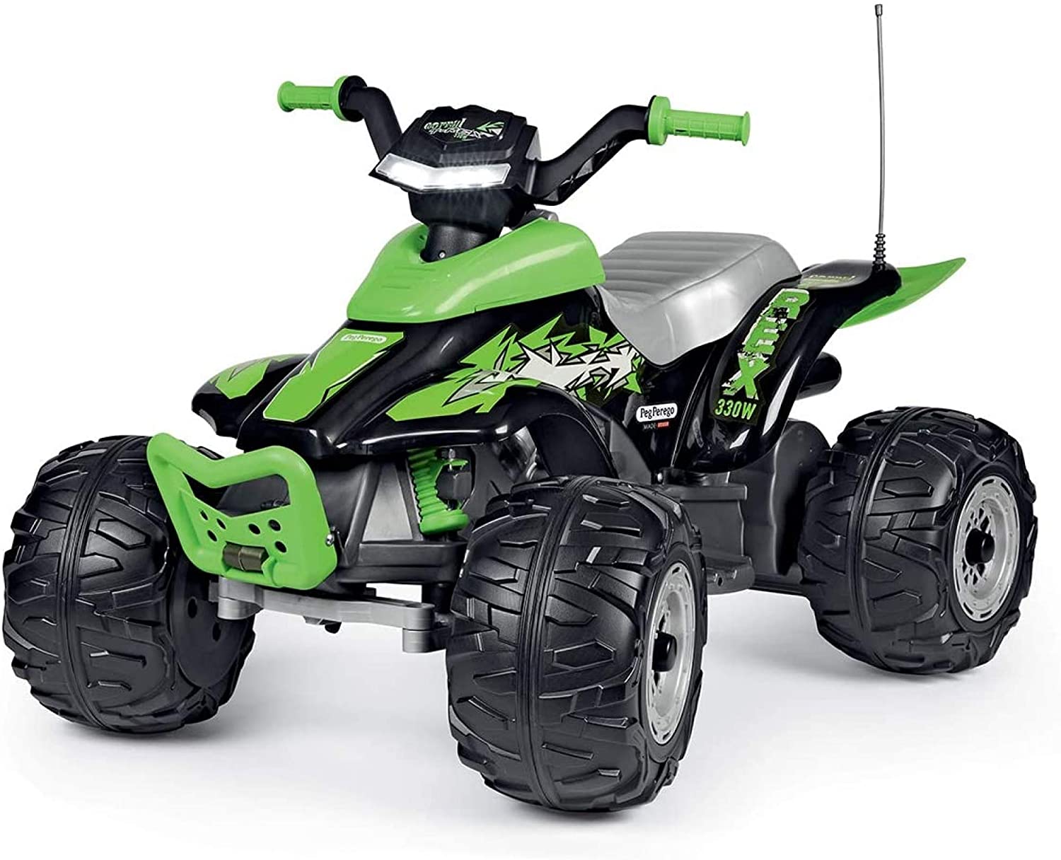 Peg Perego Corral T-Rex 330W Der Corral T-Rex 330W von Peg Perego ist ein Quad perfekt für junge Entdecker. Dank seiner großen Räder ist der Sitz höher, was die Fahrt im Gelände sicherer macht. Der Corral T-Rex erreicht eine Höchstgeschwindigkeit von 6,7 km/h. Die hinteren Kotflügel schützen vor Matsch und verleihen der Karosserie ein dynamisches Aussehen. Die rutschfesten Griffe mit Beschichtung sorgen für einen sicheren Halt der Hände an den Lenkern. Der Corral T-Rex hat alles, was sich große Abenteurer für einen tollen Fahrspaß wünschen. Die breiten Fußstützen sorgen für Stabilität in selbst den engsten Kurven. Und sollte ihr Kind größer werden, kein Problem, die breite Sitzfläche ist auch sehr gut für größere Abenteurer geeignet. Das Gaspedal dient gleichzeitig als Bremse – sobald man vom Pedal geht, blockieren die Räder und das Fahrzeug kommt zügig zum stehen. Der Schalthebel kann in drei Positionen eingestellt werden: In den ersten, den zweiten und den Rückwärtsgang. Mit einer Höchstgeschwindigkeit von 6,7 km/h im 2. Gang meistert das Quad Steigungen bis zu 10 %. Der zweite Gang kann von den Eltern bei Bedarf über eine Sicherheitssperre mechanisch gesperrt werden, bis das Kind das Fahrzeug vollkommen beherrscht. Bis dahin kann im ersten Gang mit gedrosselter Geschwindigkeit gefahren werden. Dank Rückwärtsgang wird auch das Rangieren bereits in frühen Jahren gelernt. Der rassige Look wird durch eine Antenne, zwei Auspuffrohre, das Prägemuster auf dem Sitz und den gesamten Motorraum unterstrichen. Der Corral T-Rex 330W hat einen geschlossenen Unterboden, um den kleinen Fahrer vor Stromkabeln zu schützen und Spritzwasser, Matsch und Sand vom Fahrzeug fern zu halten. Spannende Licht und Sound Effekte machen die Fahrt zu einem Erlebnis, die integrierte Hupe und der Motor-Sound lassen das Fahrzeug noch echter wirken. Dank der integrierten Batteriestatusanzeige weiß man, wann der Akku wieder aufgeladen werden muss. Ein mp3-Player kann angeschlossen werden und den kleinen Nachwuchsfahrer mit seiner Lieblingsmusik bespaßen. Der Akku ist unter dem Sitz untergebracht und wird durch einen kindersicheren Batteriehalter geschützt. Er kann mit dem mitgelieferten Ladegerät und einer normalen Haushaltssteckdose direkt vom Fahrzeug aus oder nach dem Entnehmen aufgeladen werden. Details: • Altersempfehlung: ab 3 Jahren geeignet • 12 Volt • 2 Antriebsmotoren mit je 165 Watt (330 Watt insgesamt) • 1 Pedal für Gas und Bremse • 2 Vorwärtsgänge (1. Gang bis 3,4 km/h, 2. Gang 6,7 km/h) • Rückwärtsgang bis zu 3,4 km/h • Kunststoff-Reifen mit Profil • Antenne, Hupe, Licht, Motor-Sound, mp3-Anschluss • Mechanische Sperre des 2. Ganges • Traglast Fahrzeug 40 kg • Maximale Steigung 10% • Akkulaufzeit ca. 33 min* • Abmessungen Lx Bx H (cm) 99,5 x 64,5 x 65,5 • Gewicht 15,3 Kg Lieferumfang: • Quad • Bedienungsanleitung • 12V Batterie-Ladegerät • Akku 12V 8 Ah Sicherheitshinweise: • Nicht für Kinder unter 3 Jahren geeignet • Nicht im Straßenverkehr nutzen • Lassen Sie ihr Kind nicht unbeaufsichtigt fahren • Bevorzugt Schutzkleidung tragen