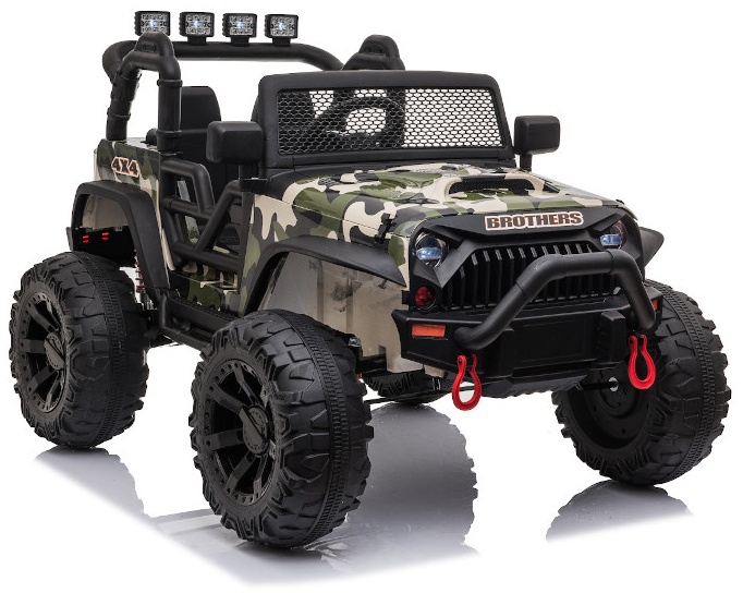 Wahlweise kann das Kind selbst mit Lenkrad bzw. Gaspedal oder die Erwachsenen können mit der 2,4Ghz 4 Wege - Fernsteuerung das Fahrzeug kontrollieren. Es ist ein MP3 Anschluss eingebaut und Sound kann reguliert werden. Dank 2x 200W Elektro Motoren hat er genug Kraft um Kinder mit mehr als 40 kg tragen zu können. Es sind Scheinwerfer eingebaut. **Die Highlights:** - EVA Reifen (Weichgummi) - Ledersitz - Bluetooth - Servo Lenkung (aktuellste Technologie) - Lackiert - Mp3 Anschluss - USB und Speicherkarteneingang - Sound Control Funktion am Dashboard - Multifunktionslenkrad mit Musik Effekten - 4x Stoßdämpfer - Softstart - Startschlüssel - Batterieanzeige - Inkl. 2,4Ghz Fernsteuerung - Bis zu 6 Km/h schnell - Scheinwerfer- vorne und hinten + Off-Road Lichter - Die Türen lassen sich öffnen - Camouflage **Technische Daten:** - Motor Leistung: 2x200W - V-Max: 3-6 km/h - Akku: 2x 12V7Ah - Fahrzeit: 1 bis 1,5 Stunden - Fernbedienung: 2,4Ghz 4 Wege - Reichweite Fernbedienung: ca. 15 M - Maße(L/B/H) : 123 x 88 x 80cm - Getriebe: Vor- Rückwärtsgang - Ladezeit: ca. 8-10 Stunden - Leergewicht: 30kg - Traglast: ca.40 Kg **Lieferumfang:** 1x Elektro Kinderauto in Camouflage Farbe, 1x 2,4Ghz Fernsteuerung, 1x Ladegerät, 1x Akku