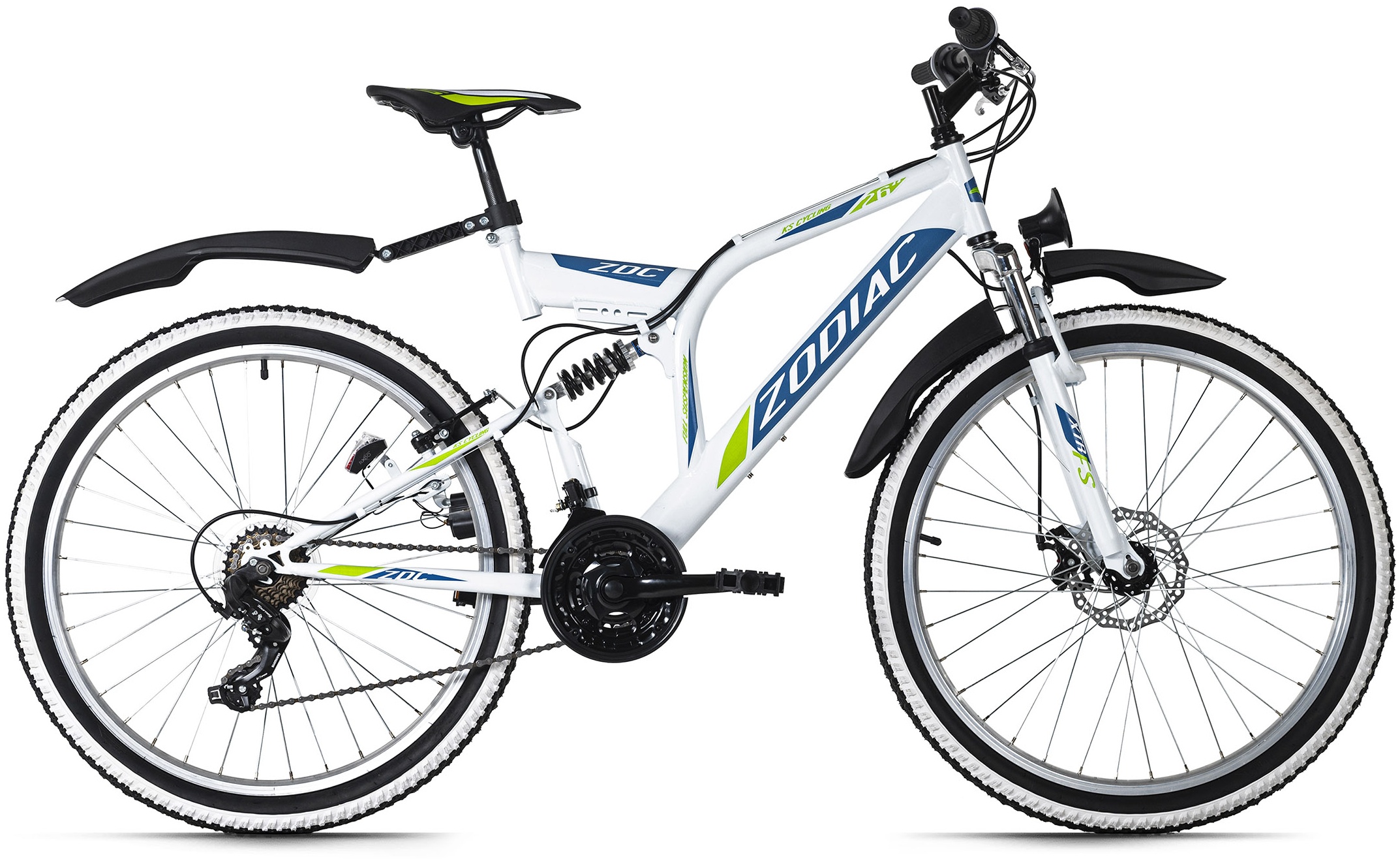 | Beschreibung | Überzeugt vom Sattel bis zum Reifen:<br>Das 26" Fully-Mountainbike Zodiac von KS Cycling hat einen schwarzen Rahmen mit farbigen Decals und ist so komplett trendig durchgestylt!<br><br>Der vollgefederte Rahmen sorgt für Fahrkomfort auf jeder Strecke. Die 21-Gang-Schaltung wird über die Drehschaltgri. |