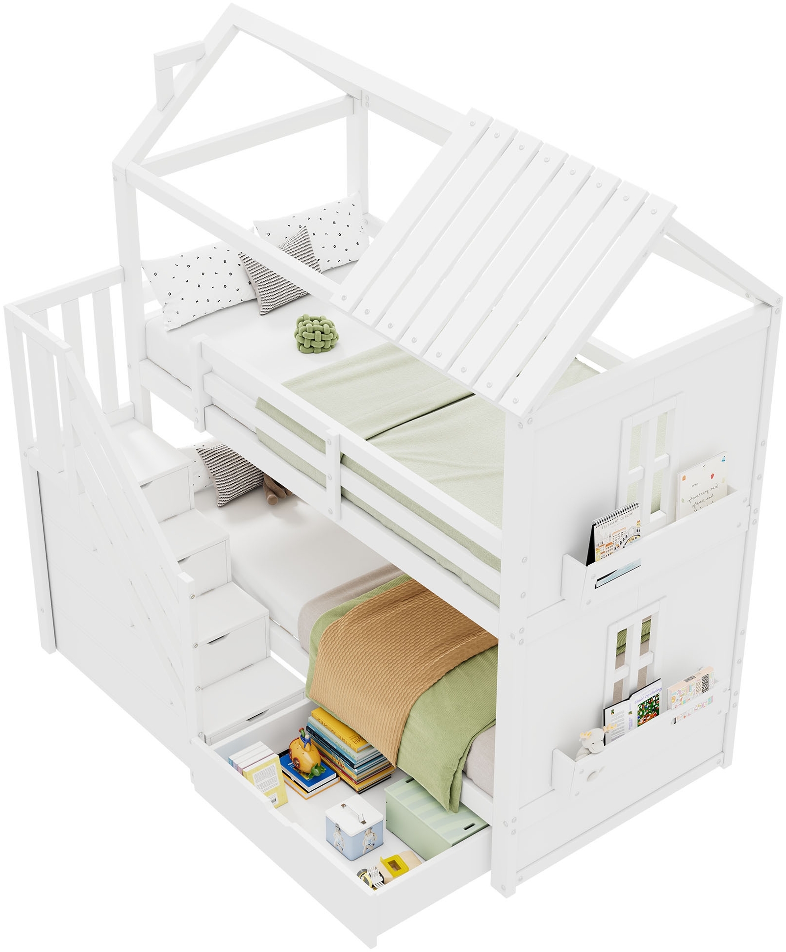 in KinderfunktionsbettenMerax Kinder-Etagenbett90*200cm, Multifunktionales Kinderbett, mit Stauraumtreppe & Schubladen & Regalen, Extra großer Stauraum, Ohne Matratze, Kiefer + MDF, Weiß