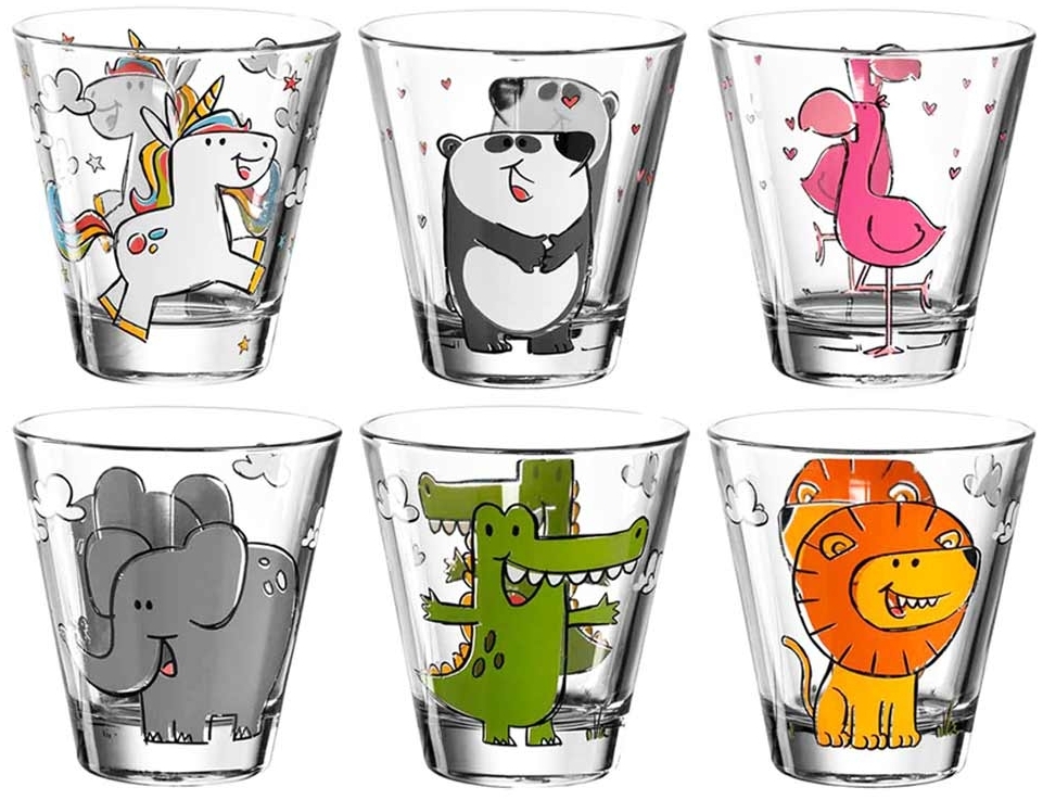 Die Leonardo BAMBINI 1 Kinderbecher sind ideal für unsere Kleinen, um das selbstständige Trinken zu üben. Das 6er Set besteht aus bunten Glasbechern mit handlicher, kindgerechter Form. Die lustigen Tiermotive machen das Trinken zu einem wilden Tierspaß. Die Becher sind spülmaschinengeeignet und behalten auch nach mehreren Spülvorgängen ihre Farbe. Jeder Becher hat ein Fassungsvermögen von ca. 120 ml (215 ml Randvollvolumen). Im Lieferumfang enthalten sind 6 Becher mit den Motiven Panda, Löwe, Einhorn, Krokodil, Elefant und Flamingo. **Highlights** - Selbstständiges Trinken üben - Handliche, kindgerechte Form - Lustige Tiermotive - Spülmaschinengeeignet - Fassungsvermögen von ca. 120 ml (215 ml Randvollvolumen) **Produkteigenschaften** - Material: Glas - Maße: 9,0 x 8,5 x 8,5 cm (HxBxT) - Durchmesser: 8,5 cm - Nutzinhalt: ca. 120 ml (215 ml Randvollvolumen) - Motive: Panda, Löwe, Einhorn, Krokodil, Elefant, Flamingo **Lieferumfang** - 6 x Bambini Kinderbecher (je 1 x Panda, Löwe, Einhorn, Krokodil, Elefant, Flamingo)