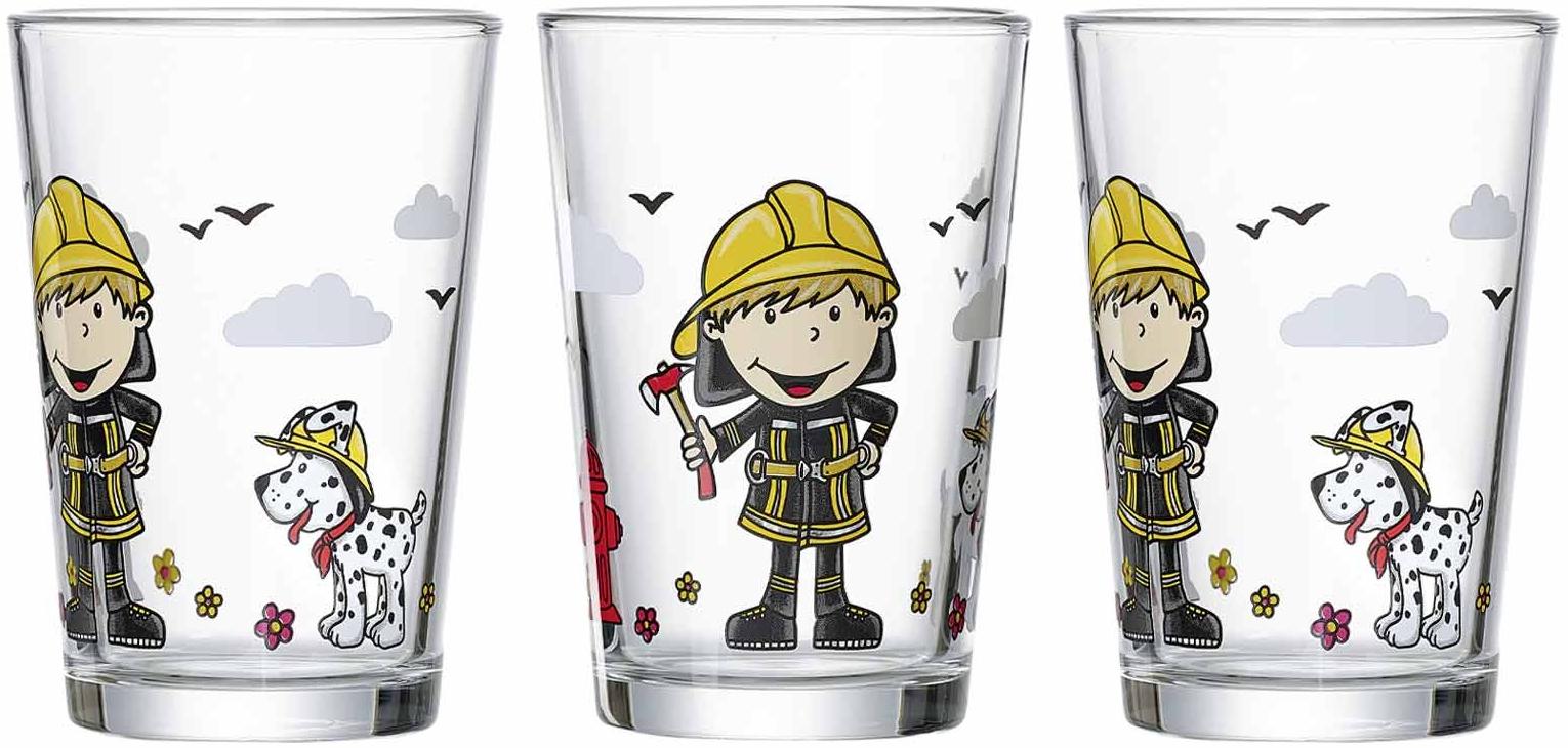**Ritzenhoff & Breker FEUERWEHRMANN BERNIE Kinderglas Set 3-teilig** Schneller als die Feuerwehr: Feuerwehrmann Bernie und sein Hund Rocky haben gerade einen Löscheinsatz erfolgreich beendet. Aus den fröhlichen Bechern trinken kleine Leute besonders gern! **Artikeldetails:** Durchmesser: ca. 7 cm Höhe: ca. 10 cm Inhalt: ca. 205 ml Nutzinhalt Merkmal: Spülmaschinengeeignet Lieferumfang: 3x Trinkglas