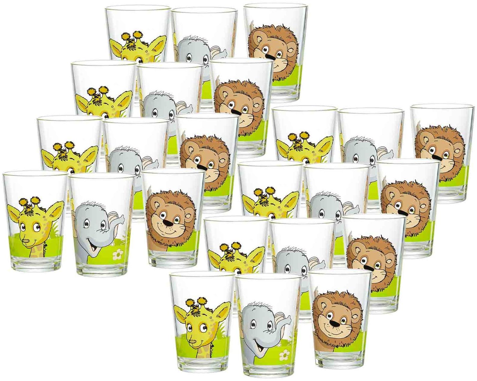 Das 24-teilige Ritzenhoff & Breker DSCHUNGELTIERE Kinderbecher Set zaubert Ihren Kindern ein Lächeln ins Gesicht. Die niedlichen Motive von Zebra, Tiger, Leopard und Löwe sorgen bei jedem Frühstück für ein aufregendes Dschungelerlebnis. Die Becher haben einen Durchmesser von ca. 7,0 cm und eine Höhe von ca. 10,0 cm. Mit einem Fassungsvermögen von ca. 205 ml sind sie ideal für den Alltag geeignet. Die Kinderbecher sind spülmaschinengeeignet und somit leicht zu reinigen. **Highlights** - Niedliche Motive von Zebra, Tiger, Leopard und Löwe - Ideal für ein aufregendes Dschungelerlebnis beim Frühstück - Spülmaschinengeeignet für eine einfache Reinigung **Produkteigenschaften** - Durchmesser: ca. 7,0 cm - Höhe: ca. 10,0 cm - Inhalt: ca. 205 ml - Motive: Löwe, Giraffe, Elefant - Material: Glas - Spülmaschinengeeignet **Lieferumfang** - 24x Trinkglas