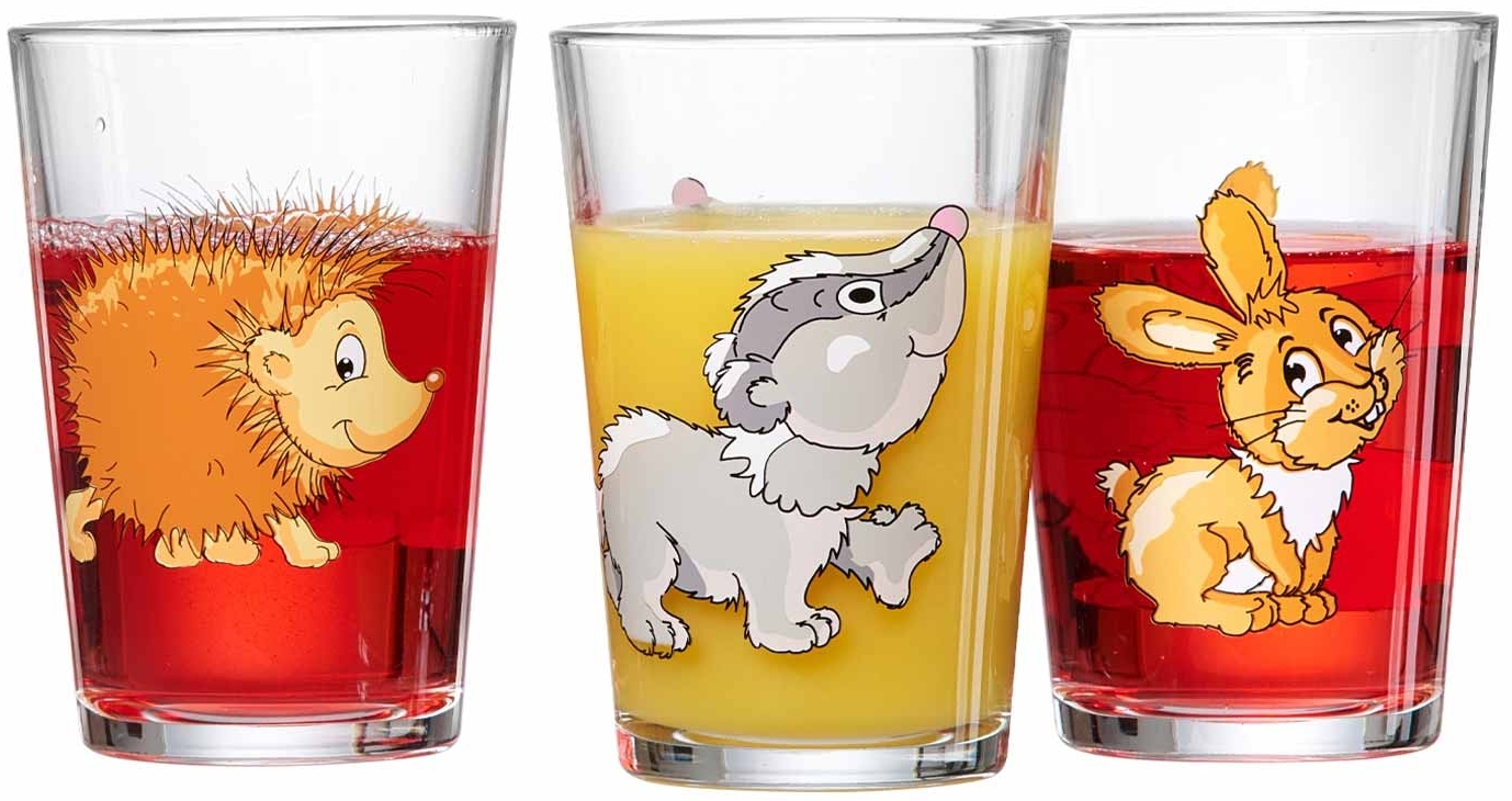 Ritzenhoff & Breker 1x WALDTIERE Kinderbecher Set 3-teilig. Das Ritzenhoff & Breker WALDTIERE Kinderglas Set besteht aus drei Kindergläsern mit niedlichen Motiven von einem Igel, einem Dachs und einem Hasen. Die Gläser haben einen Durchmesser von ca. 7 cm und eine Höhe von ca. 10 cm. Mit einem Nutzinhalt von ca. 205 ml sind sie ideal für den Alltag. Die Gläser sind spülmaschinengeeignet und sorgen für viel Spaß beim Trinken. **Highlights** - Set mit drei Kindergläsern - Niedliche Motive von Waldtieren - Spülmaschinengeeignet **Produkteigenschaften** - Durchmesser: ca. 7 cm - Höhe: ca. 10 cm - Inhalt: ca. 205 ml - Nutzinhalt - Spülmaschinengeeignet **Lieferumfang** - 3x Trinkglas