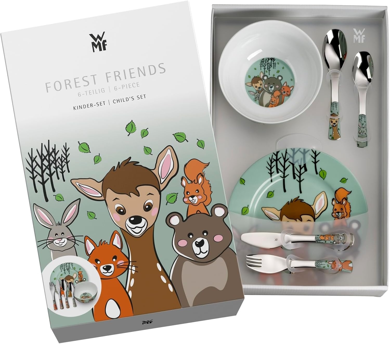 | Name | WMF Kindergeschirr-Set Waldfreunde (6-tlg), 1 Personen, Cromargan® Edelstahl Rostfrei 18/10, Porzellan, ab 3 Jahren, hygienisch, säurefest |