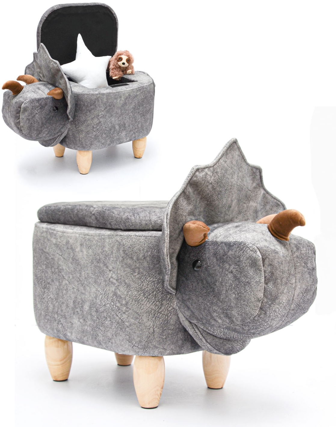 Dino Spielzeug Hocker mit Stauraum – der perfekte Begleiter für das Kinderzimmer. Mit einem plüschigen Samtbezug und knautschigen Hörnern ist dieser Hocker nicht nur ein praktischer Sitzplatz, sondern auch ein dekoratives Element. Der Hocker hat die Maße von ca. 70 x 40 x 50 cm, eine Sitzhöhe von ca. 37 cm und bietet im Inneren ein Geheimfach mit 9 Litern Stauraum für Spielzeug und Süßigkeiten. **Highlights** - Dinosaurier Hocker mit Stauraum - Plüschiger Samtbezug und knautschige Hörner - Geheimfach mit 9 Liter Stauraum - Belastbar bis 120 kg - Hochwertiger Stoffbezug in edlem Grau **Produkteigenschaften** - Abmessungen: ca. 70 x 40 x 50 cm - Sitzhöhe: ca. 37 cm - Gewicht: ca. 4 kg - Innenfach: ca. 22 x 19 x 22 cm - Sitzfläche: ca. 39 x 29 cm - Material: 100% Polyester - Aufbau ohne Werkzeug - Pflegeleicht **Lieferumfang** - Dino Spielzeug Hocker mit Stauraum - Filzgleiter - Holzbeine (zum Anschrauben)