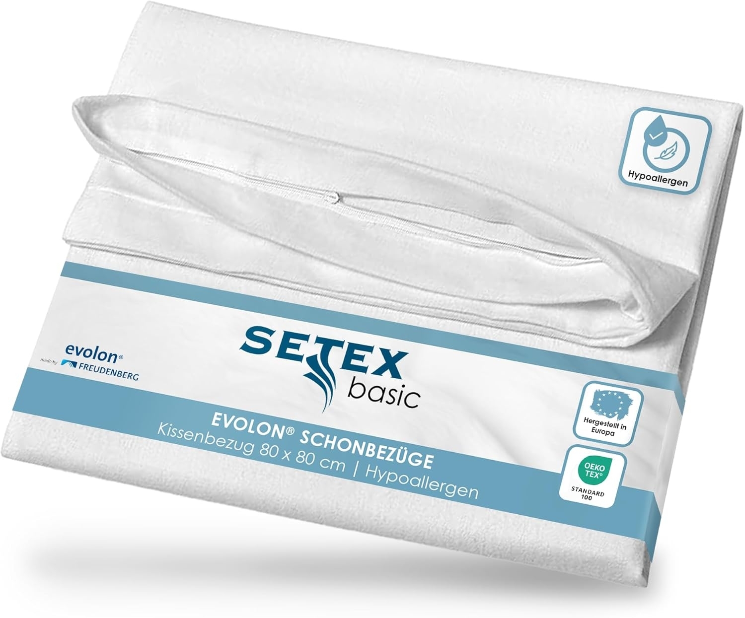 Der SETEX Kissenbezug EVOLON (1 Stück) bietet optimalen Milbenschutz durch seine speziellen Materialeigenschaften. Das mikrofeine Vlies (Evolon®) gewährleistet hohe Luft- und Wasserdampfdurchlässigkeit. Der Bezug ist mit einem Optilon® Marken-Reißverschluss ausgestattet und eignet sich für Matratzen bis zu 20 cm Höhe. Er ist pflegeleicht und kann bis zu 95 °C gewaschen werden. **Highlights** - Milbenschutz durch Materialeigenschaften - Hohe Luft- und Wasserdampfdurchlässigkeit - Konfektioniert mit Optilon® Marken-Reißverschluss - Made in Germany - Pflegehinweis: bis zu 95 °C waschbar **Produkteigenschaften** - Bezug: 70% Polyester / 30% Polyamid-Vlies - Flächengewicht: ca. 100 g/m² - Passend für Matratzen bis zu 20 cm Höhe - Trocknergeeignet, bügelbar, nicht bleichen, nicht chloren - Kissenschutzbezug für 80 x 80 cm Kissen - Temperaturausgleichend und hautsympathisch - Schadstoffgeprüft - STANDARD 100 by OEKO-TEX (Zert. Nr.: 07.0.49905 / Prüfinstitut: Hohenstein) **Lieferumfang** - 1 SETEX Kissenschutzbezug, Größe: 80 x 80 cm - Material: 70% Polyester / 30% Polyamid-Vlies - Farbe: Weiß