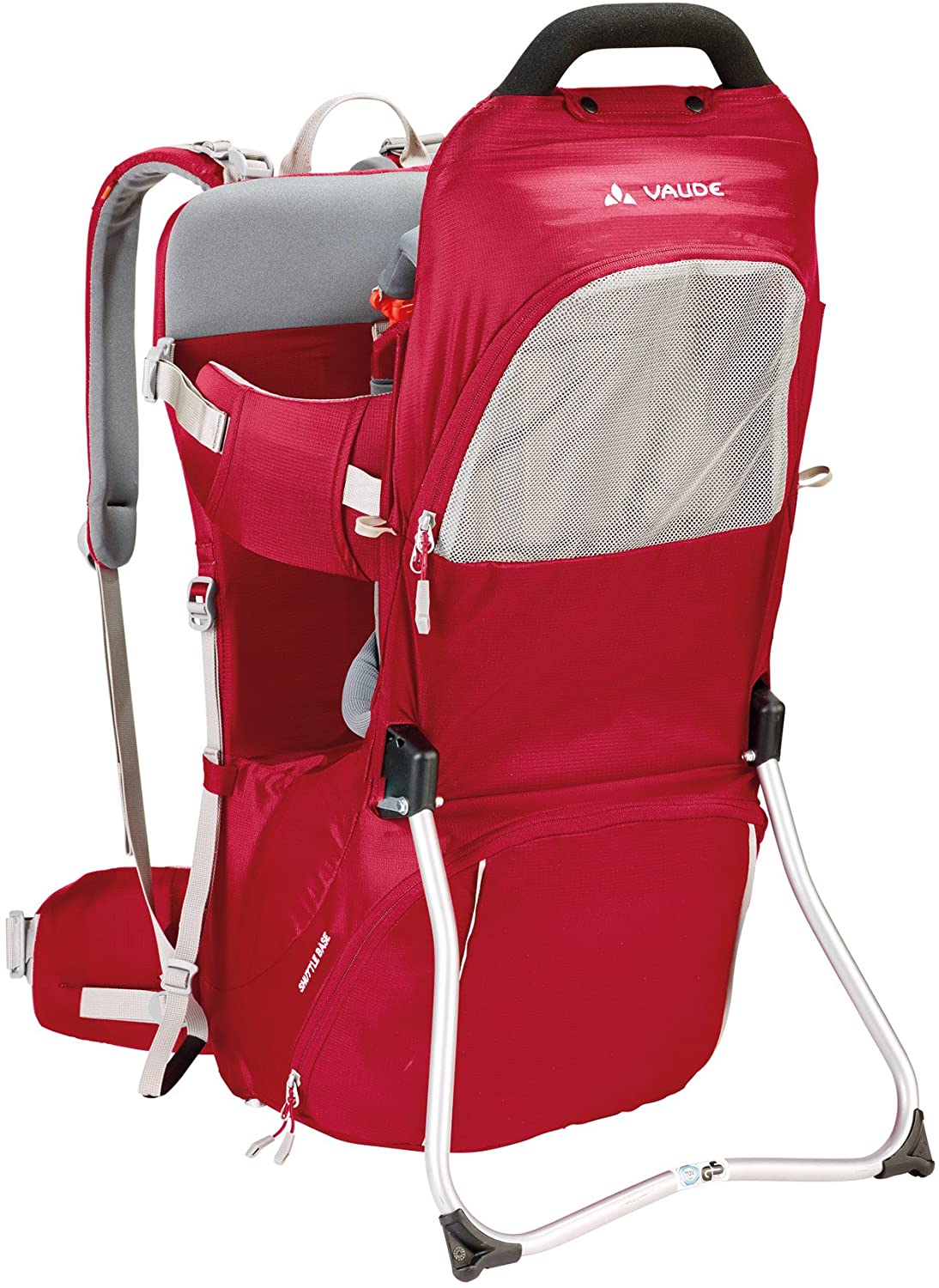 Leichte Kindertrage. Farbe: Rot / Größe: 20l - "Kinderleicht" auf Tour! Die Shuttle Base ist die Light-Variante des beliebten Bestsellers Shuttle Comfort von Vaude. Die neu entwickelte Kindertrage Shuttle Base von Vaude aus bluesign®-zertifizierten Hauptmaterial spart seinem künftigen Besitzer einiges an Gewicht. Und dennoch wurde auch hier das ganze Vaude Know-how untergebracht: Die bequem gepolsterte Tergolight-Rückenkonstruktion und die gewichtsentlastenden Hüftpolster ermöglichen, dass die Kindertrage sicher und komfortabel am Rücken sitzt, was vor allem in unwegsamem Gelände wichtig ist. Für TÜV-geprüfte Sicherheit sorgen u. a. das stabile Standfußgelenk und die für die Kindersicherheit wichtigen Anschnallgurte, deren Verschlüsse in Orange hervorgehoben wurden. Auch sonst bietet die Shuttle Base alles, was eine gut ausgestattete Kindertrage braucht: variabel auf die Körpergröße einstellbare Gurte, reflektierende Elementale auf der Rückseite, geräumige Taschen und Täschchen für Trinkflasche, Windeln und Kleinutensilien und ein großes Bodenfach für größere Gepäckstücke wie Sitzdecke, Jacke, Spielzeug und Brotzeit. Die seitlichen Fußschlaufen können exakt auf die Beinlänge eingestellt werden; so schlafen dem Kind die Füße nicht ein und es kann die Tour in vollen Zügen genießen. Ein Sonnenschutzdach, ein großer Regenüberzug sowie Kopfstützen und weitere Accessoires wie der leicht waschbare Froschaugen-Aufsatz können optional dazu bestellt werden. Die Shuttle Base von Vaude eignet sich für Kinder bis ca. 105 cm Körpergröße bzw. bis zu 18 kg Körpergewicht. Das Abenteuer kann beginnen! - Unterstützender, individuell einstellbarer Rücken - Gepolsterter Hüftgurt mit Tasche - Variable Sitzhöhe - Netz-Außentasche - Separates Bodenfach - Griffe an Vorder- und Rückseite - Individuell verstellbare Fußstützen - Reflektierende Elementale - Volumen: 20 Liter - Abmessungen: 72 x 35 x 41 cm - Gewicht: 2. 560 g - Max. Ladegewicht: 22 kg - Max. Alter: 3 Jahre - Hauptmaterial: 100% Polyamid / 210d Mini Ripstop Polyurethan beschichtet - Rückenteil: 100% Polyester / 600d Polyurethan beschichtet - Futter: 100% Polyamid (Nylon) / 200d Polyurethan beschichtet - Material: 200 D Polyurethan beschichtet, 210d Mini Ripstop, 600d Polyurethan beschichtet