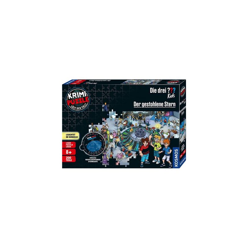 Was genau ist in der Sternwarte geschehen? Der berühmte Sänger Willi Stardust ist verschwunden und mit ihm die wertvolle Sonne aus einem alten Modell. Jetzt sind Die drei ??? Justus, Peter und Bob gefragt! Sie müssen das Geschehene rekonstruieren und erhalten Hilfe: Kinder ab 8 Jahren lesen die spannende Kurzgeschichte und legen Puzzleteil für Puzzleteil ein Wimmelbild zusammen. Im 200 Teile starken Puzzle sind Hinweise und Rätsel versteckt, die den Detektiven bei der Auflösung des Falles weiterhelfen. Mit Sternenkarte zum selber Basteln. Das Puzzle leuchtet im Dunkeln - eine coole Deko fürs Kinderzimmer und ein tolles Geburtstagsgeschenk. Inhalt:200 Teile Puzzle (Format: 54 x 38 cm), Anleitung mit exklusiver Kurzgeschichte und Lösungsteil, nachtleuchtende Sternkarte zum Basteln Warnhinweis: Achtung! Nicht für Kinder unter 36 Monaten geeignet Achtung! Enthält verschluckbare Kleinteile. Erstickungsgefahr. Bei Sortimenten und Großpackungen gilt der angegebene Preis pro Stück. Eine Auswahl ist nur bedingt möglich!
