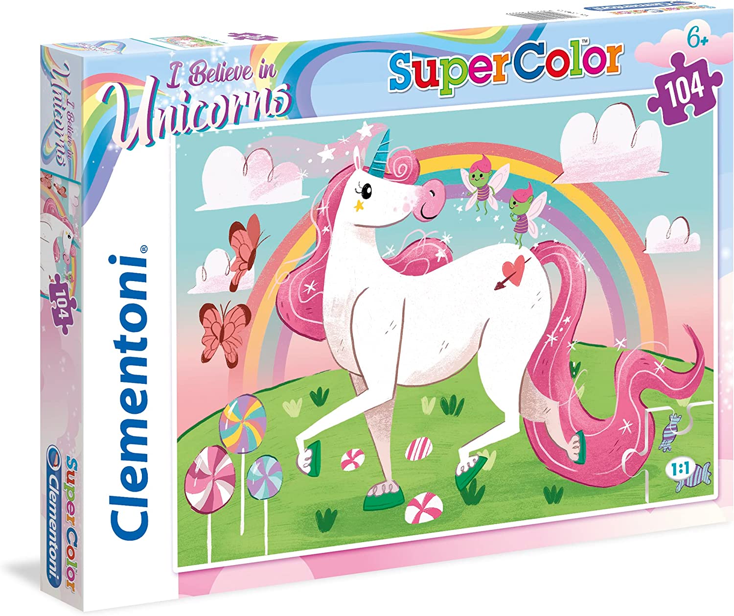 - Das Clementoni Supercolor-Puzzlespiel Einhorn besteht aus 104 Teilen, die speziell für Kinder entwickelt wurden.